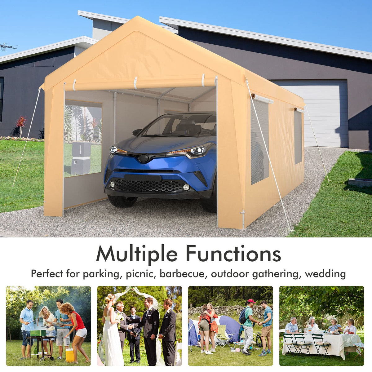 - Roll up Window & Removable Side Wall: This car canopy features four removable sidewalls, which provides multiple using methods. And the front door and back door are both equipped with convenient zippers, which you could roll up and fix with straps. Moreover, the cover of windows on the two sides can also be rolled up or put down as your need.