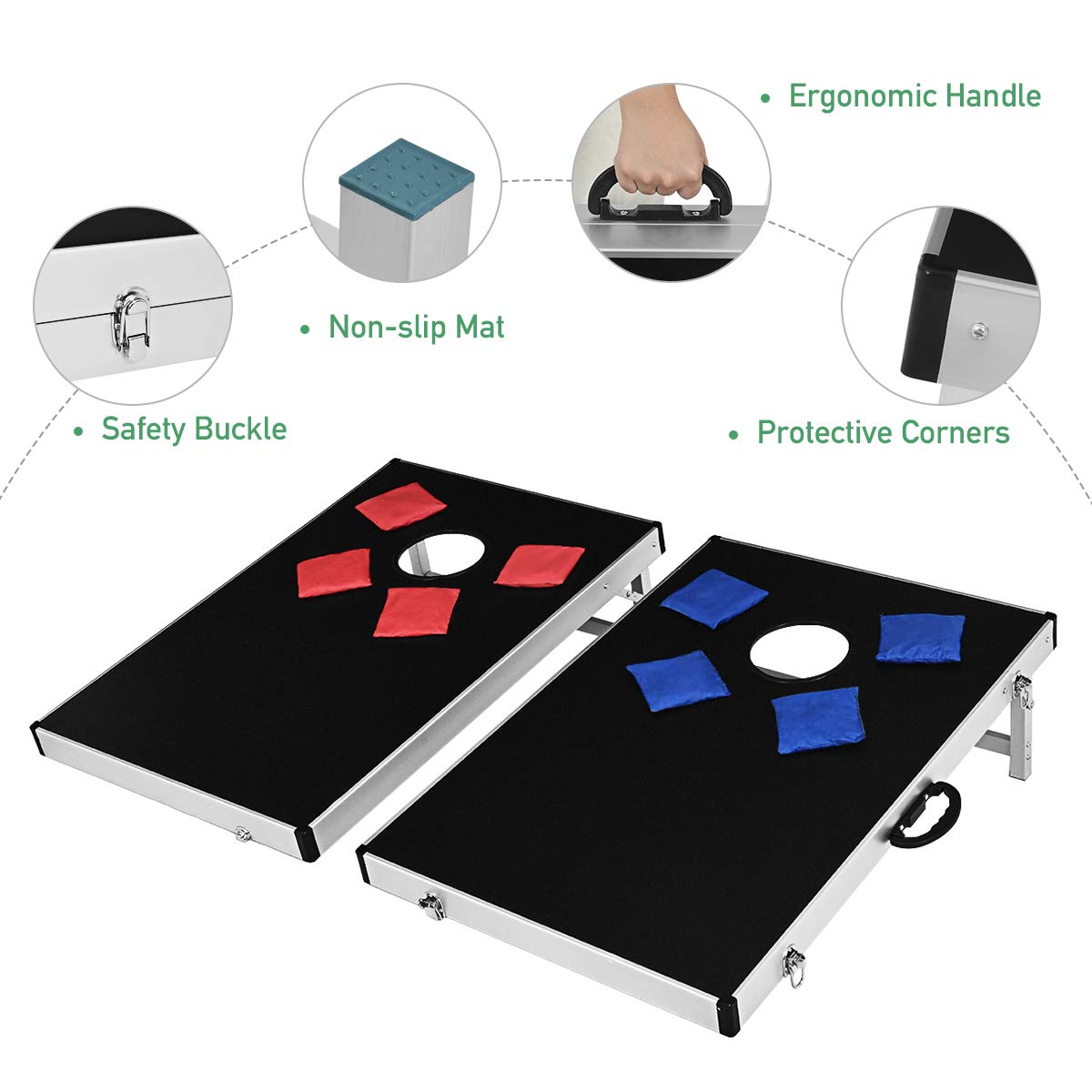 - 【Foldable & Lightweight】Designed with the foldable principle with portable carring handles and inner cornhole bag storage space, this outdoor cornhole game set provides you with the optimal outdoor game experience. It folds and packs easily into limited trunk space.