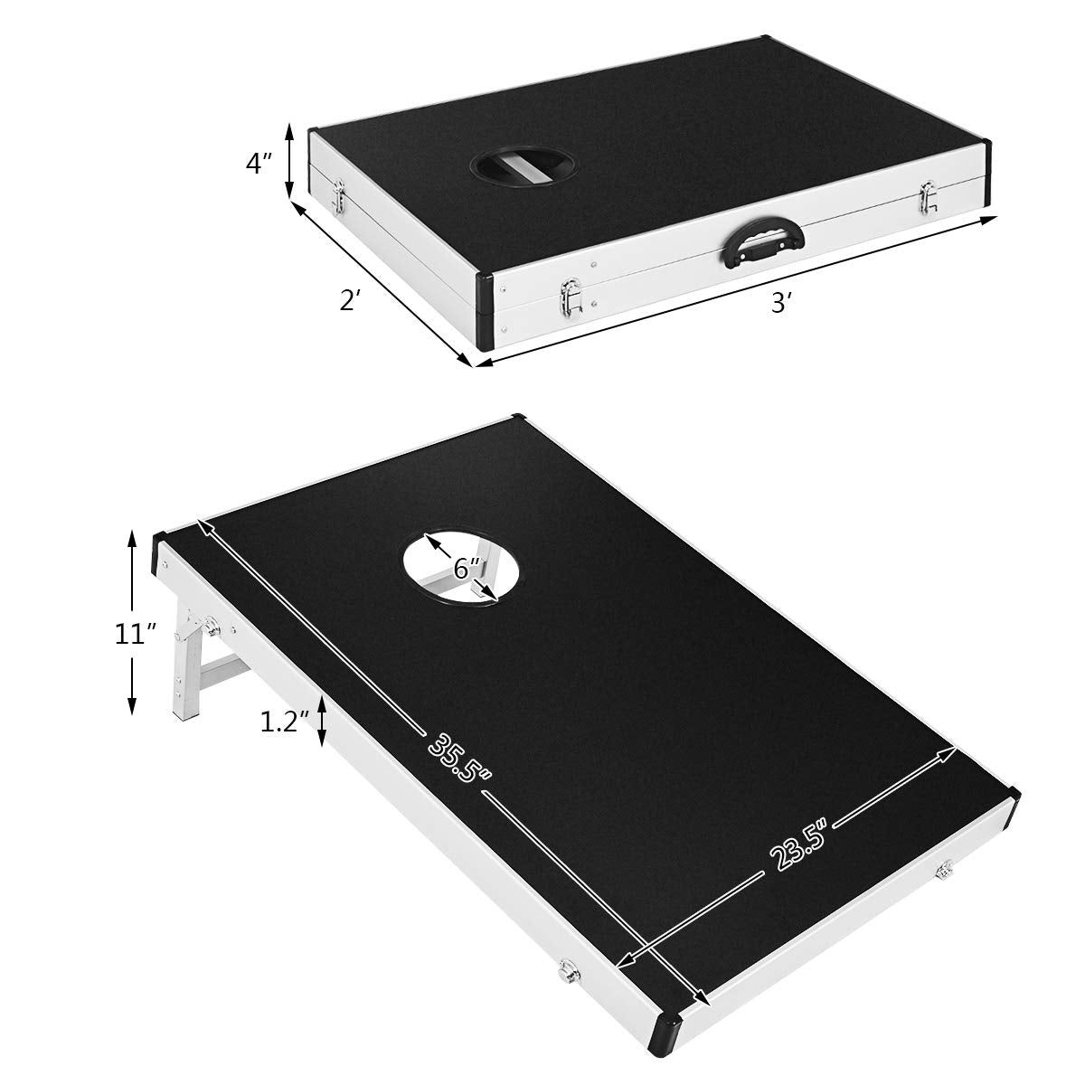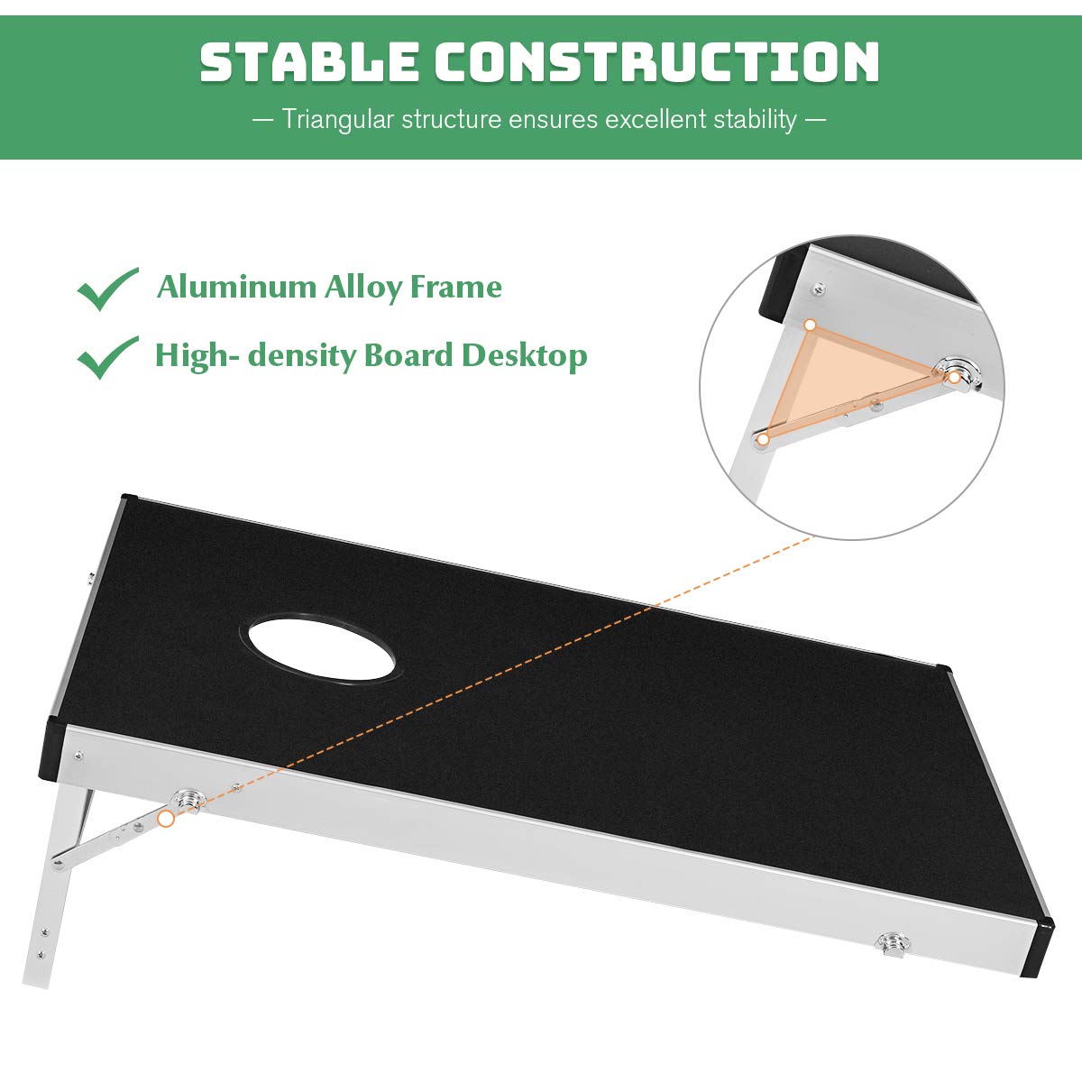 - 【Stable & Durable Structure】Crafted of high quality aluminum alloy, this 2 cornhole board can be transformed to triangle structure, sturdy enough to withstand the impact force during cornhole games. And the large tossing area with hole design allow for an effortless slide after tossing.