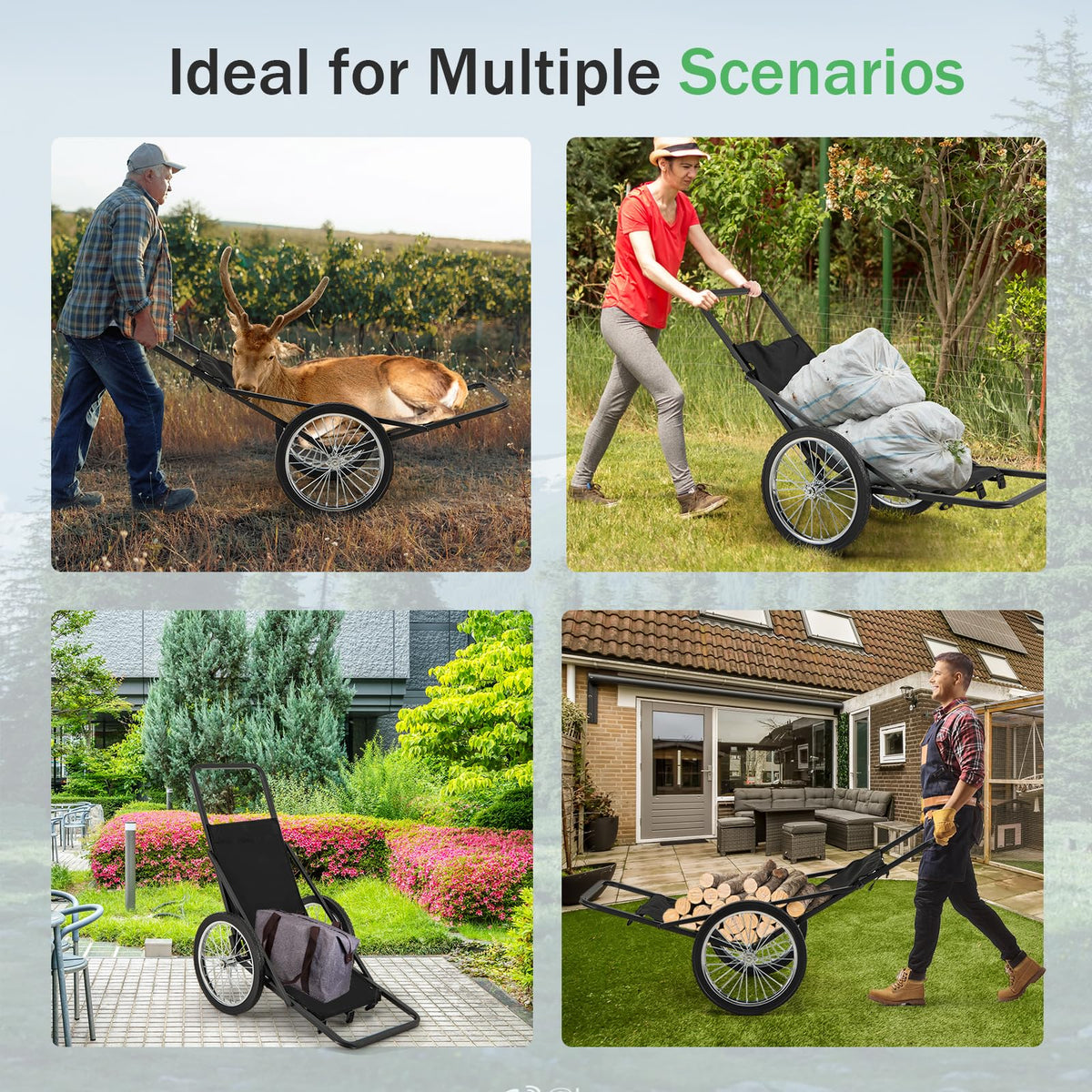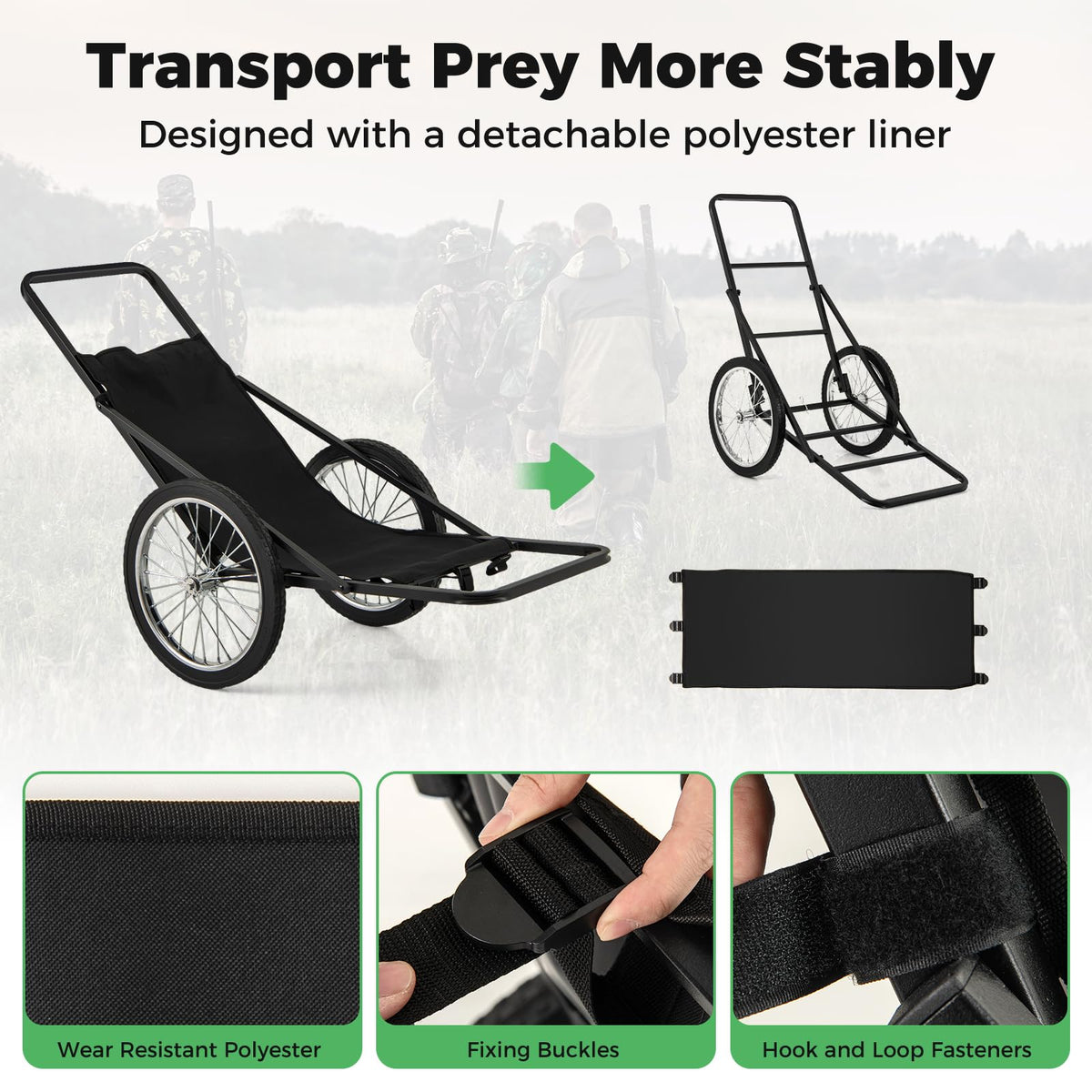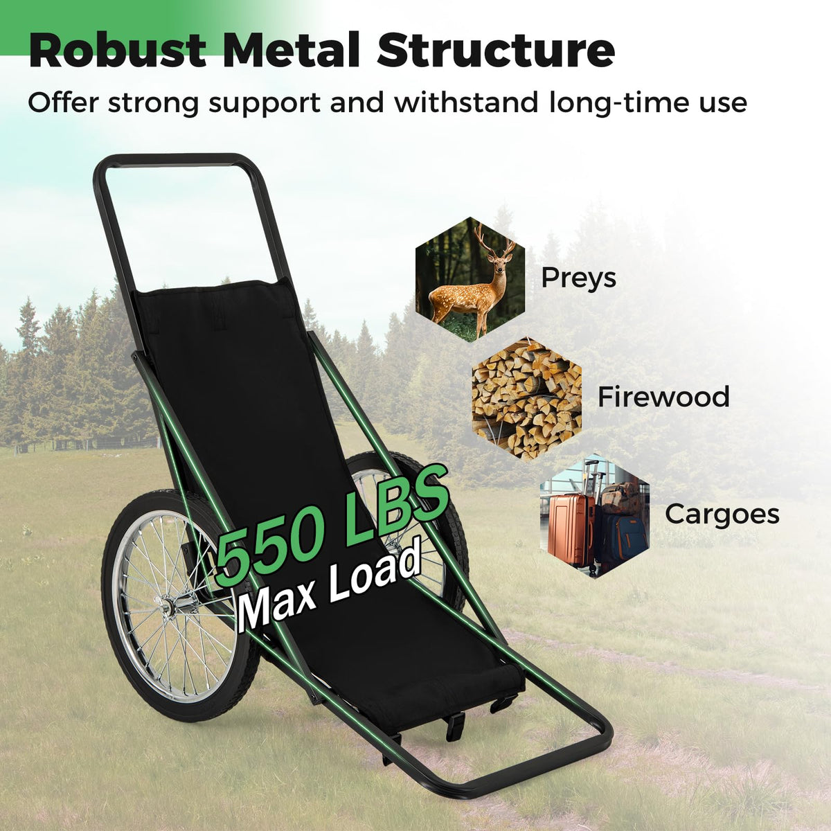 Our deer game cart is ideal for hunters to haul games, gear or hunting equipment from the field to truck. Moreover, you can use it to carry firewood as you need. This hunting cart is constructed from solid steel tubes, making it stable and strong enough to transport trophy game weighing up to 500 lbs. And the large 20’’ wheels with rubber tire are wear-resistant and sturdy, which are suitable for various roads and ideal for hunting in the forest. What's more, t his deer game cart can be easily folded, which is convenient to carry or storage.