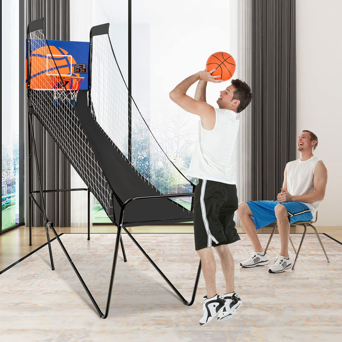- Complete Set: Coming with 3 basketballs and a pump, this foldable basketball game indoor is perfect for practicing shooting skills alone or challenging your family or friends in an exciting game! Equipped with electronic scorer and buzzer, the machine allows you to check whether you get higher score and break the record.