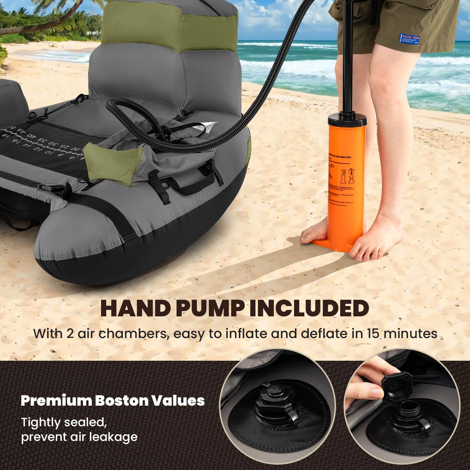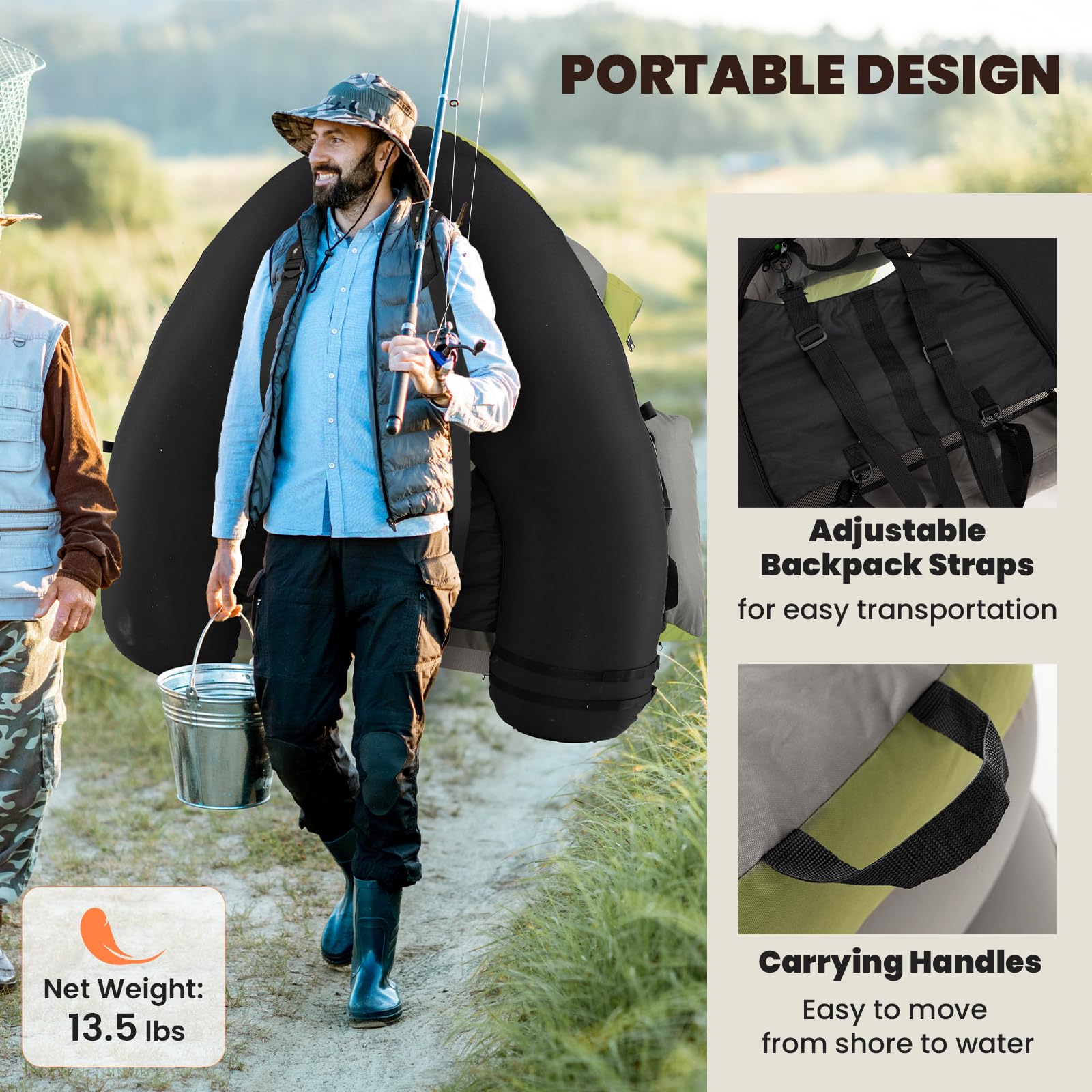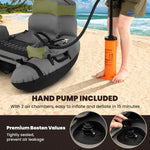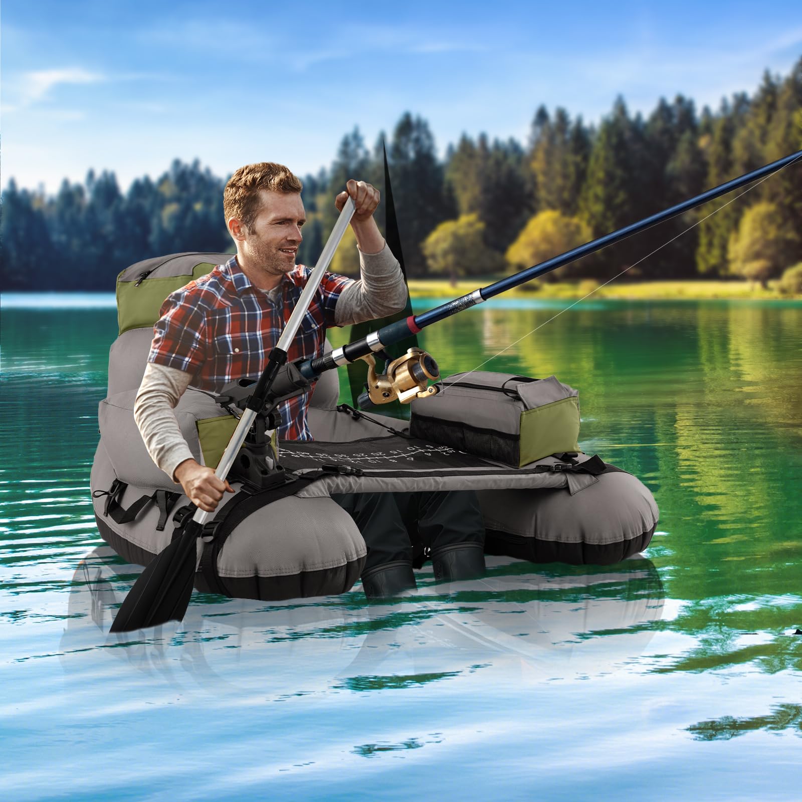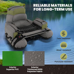 Our inflatable fishing float tube supports a substantial load of 350 lbs making it ideal for solo fishing expeditions. It's crafted from top-notch materials - superior PV and a heavy-duty 600D polyester exterior - ensuring it withstands various aquatic conditions and extends its lifespan. For enhanced convenience, the tube features adjustable backpack straps and carrying handles, facilitating easy transport from dry land to any body of water. Additionally, it boasts adjustable fishing rod holders and a fish ruler for those pivotal moments when you capture your prize. Convenience is further amplified by the integration of 2 quick-inflate chambers equipped with premium Boston valves that minimize air leakage, equipped with a pump to get you on the water quicker. This inflatable fishing float tube is crafted to offer not only functionality but also ease, making each fishing journey memorable.