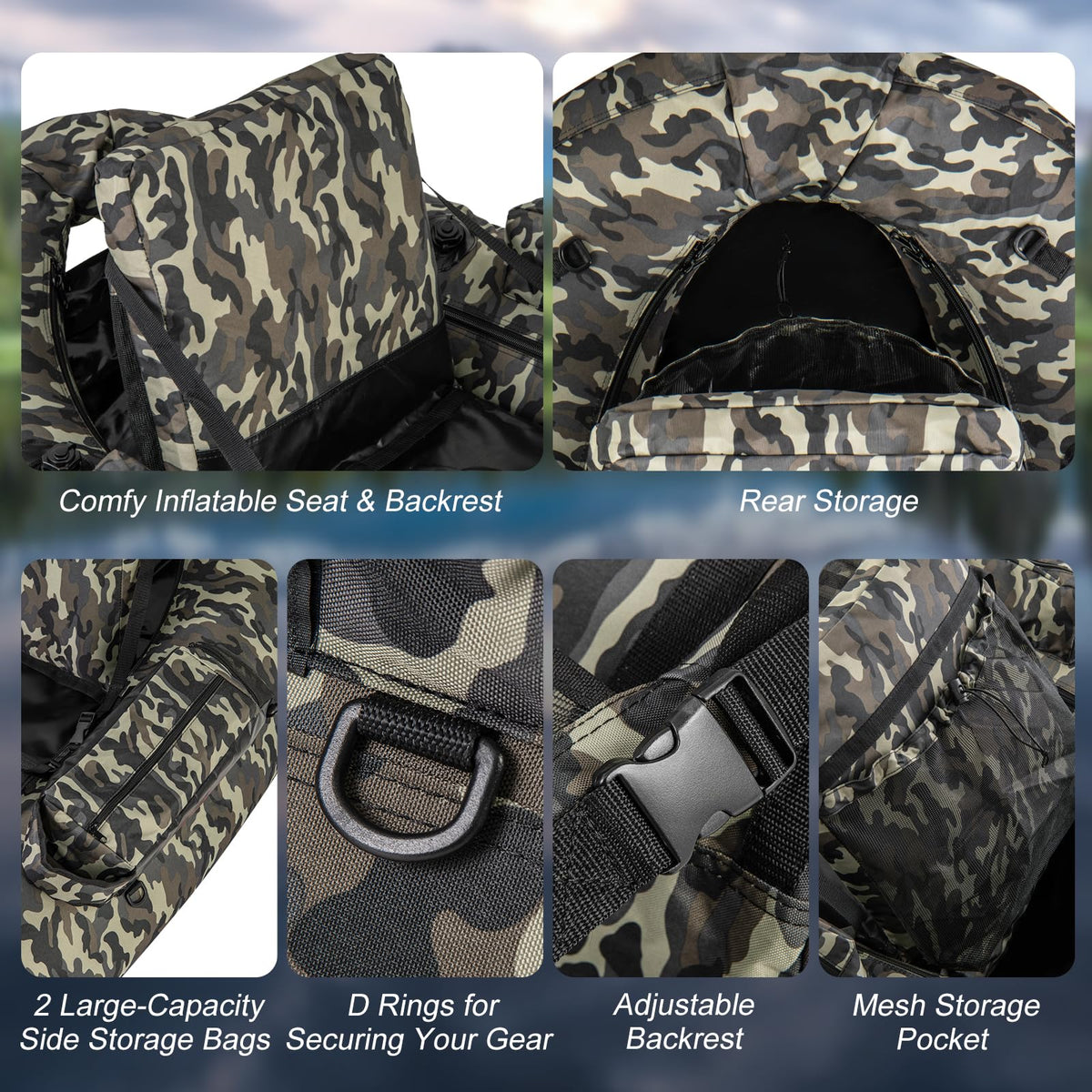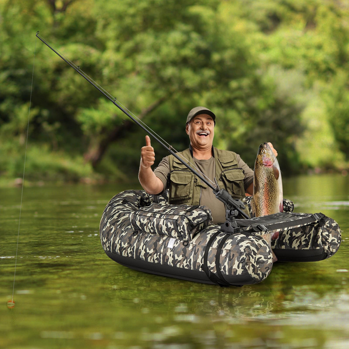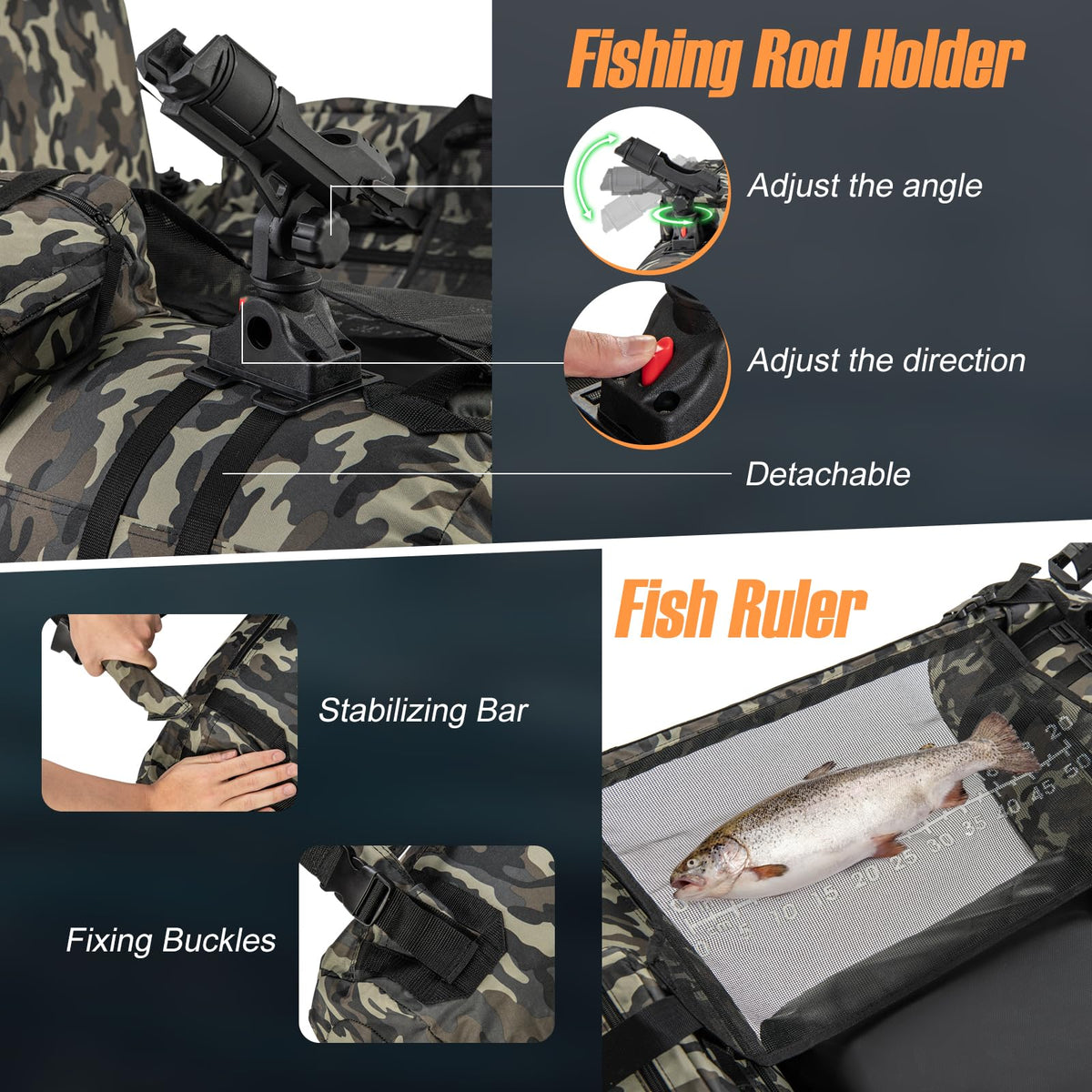 - High Loading Capacity: The inflatable fishing float tube measures 58" x 43" x 17.5" (L x W x H) and ensures a strong loading capacity of 350 lbs, providing excellent stability and buoyancy for a smooth and safe riding in water. Additionally, the inflatable seat and adjustable backrest ensure comfortable sitting throughout your fishing adventures.