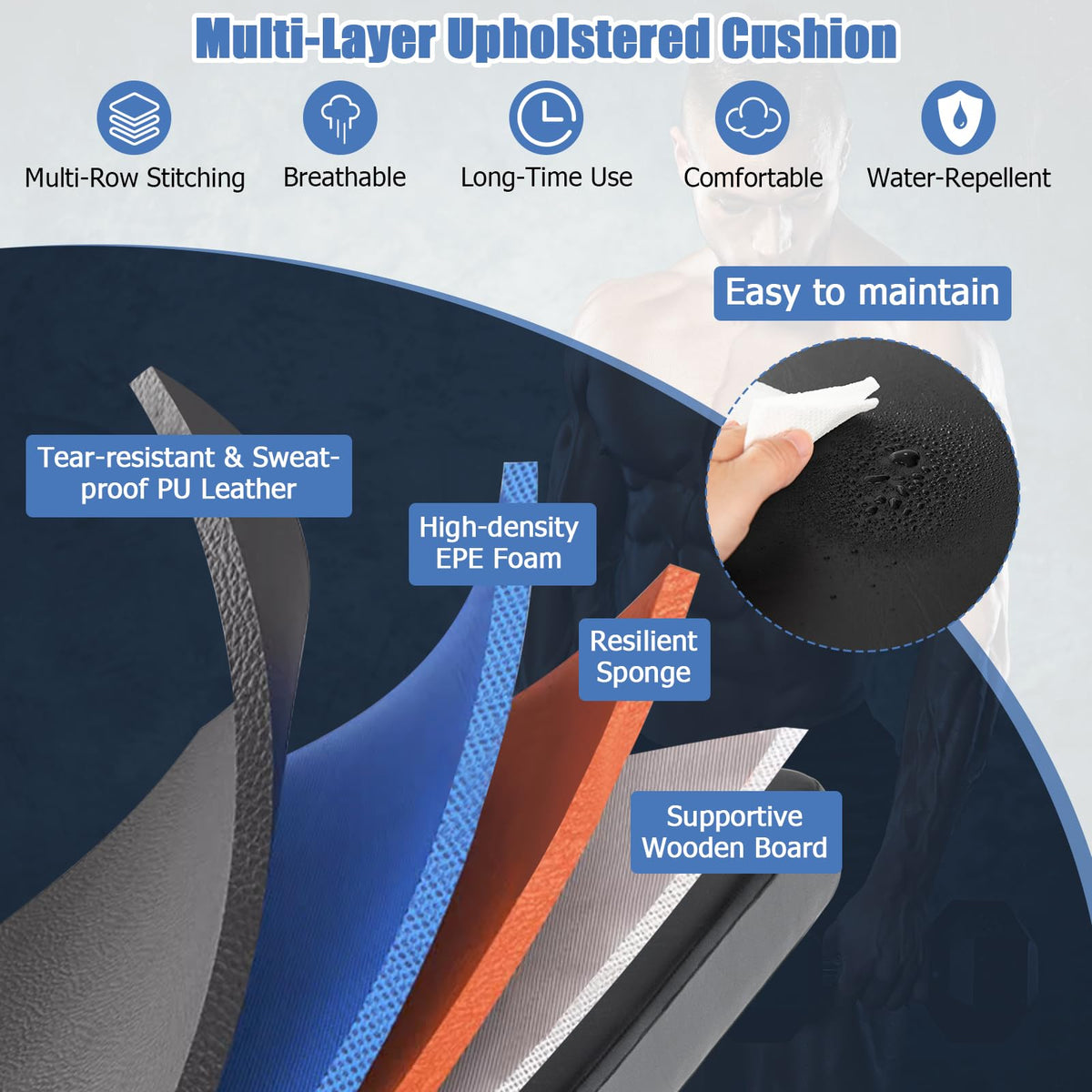 - Better Exercise Experience: The multi-layer construction includes tear resistant and swear-proof PU leather, high density EPE foam, resilient sponge and supportive wooden board. 2" thick padded cushion provides a strong and comfy support to your back during training.