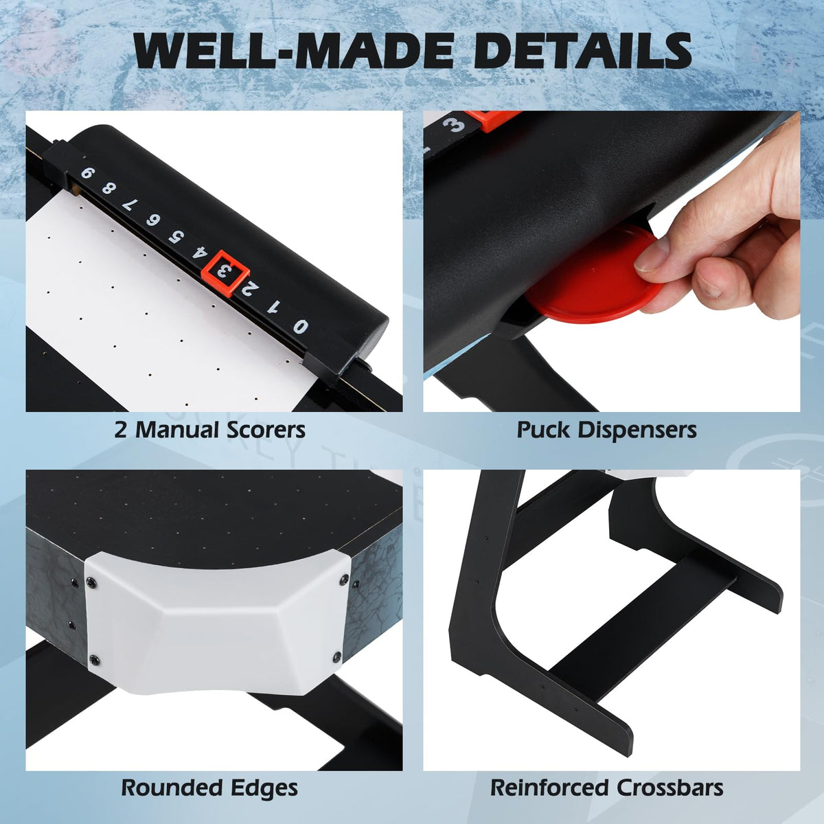 Featuring a powerful motor and dense air holes, this air hockey game table ensures lightning-fast puck action for smooth gameplay. The LED digital scoreboard adds a professional touch to matches and simplifies score tracking. With a space-saving foldable design, this arcade game table is perfect for limited spaces. Complete with 2 pushers and pucks, this arcade-style table is suitable for all ages, making it a perfect gift for children and providing endless entertainment for friends and family alike.