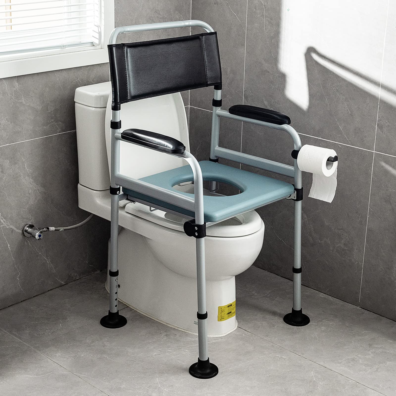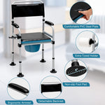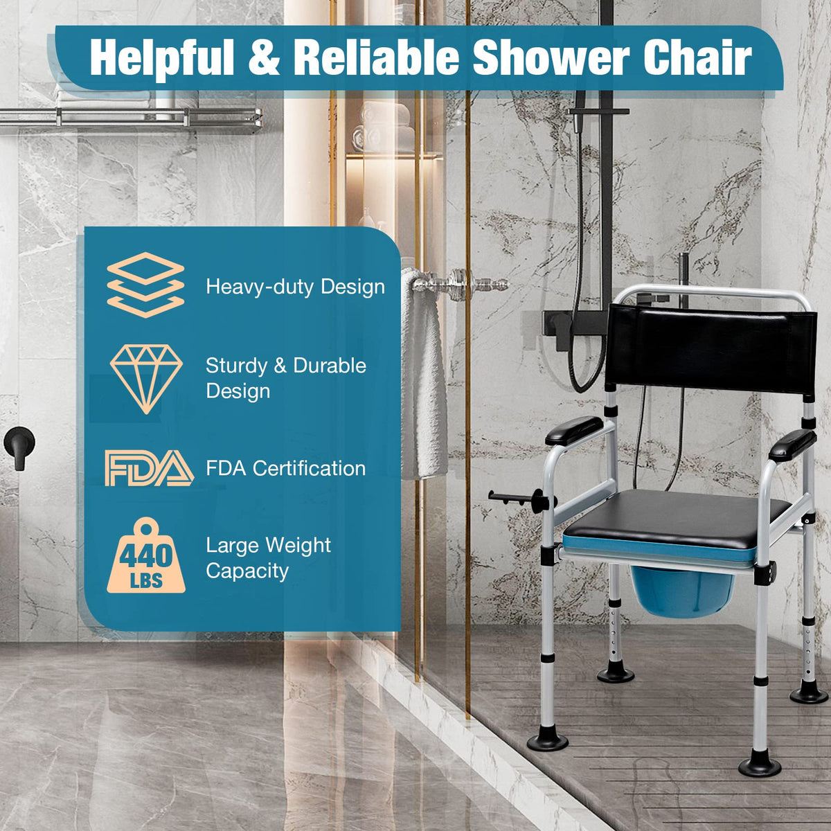 Multifunctional toilet chairs make life easier for the elderly, the disabled, the injured and the pregnant! Not only a portable toilet, but also a shower chair, toilet safety guard, or a regular chair! Made of high carbon steel, this commode chair is extremely stable and durable and can hold up to 440 lbs. The removable backrest and adjustable height (17.5" - 21.5") makes is it suitable for people different height. Besides, the thick PU cushion and armrests improve using experience. In addition, four enlarged plastic feet make the chair stable even in bathroom. Folding design makes this chair easy to move or store, suitable for use in homes, hospitals and nursing homes!