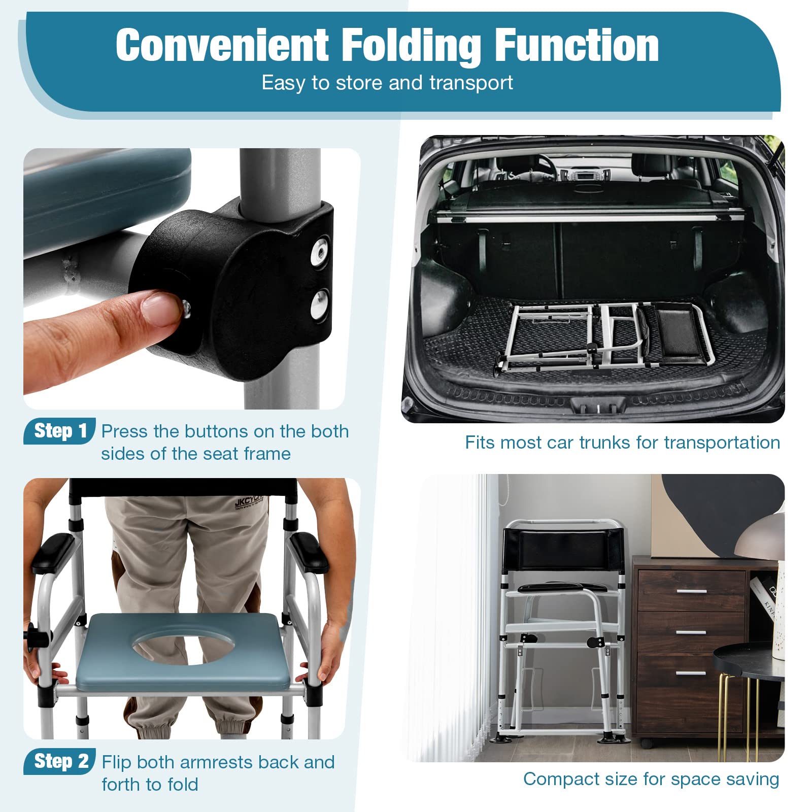 - Foldable & Portable: Simply pressing the buttons on both sides of the chair, you can easily fold this commode chair in few seconds. Measuring 20” x 8” x 36.5” (L x W x H) when folded and weighing 19 lbs, this portable commode is effortless to carry and store.