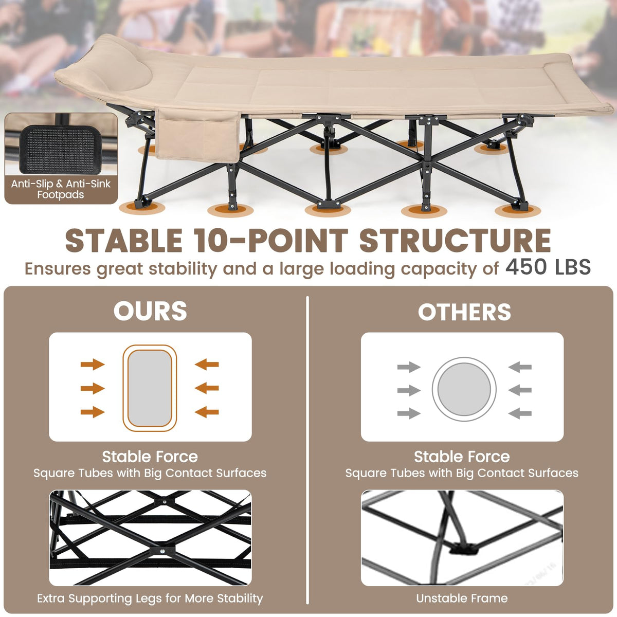 - Stable 10-Point Structure: The heavy-duty sleeping cot is supported by 10 metal legs and adopts anti-slip and anti-sink footpads, ensuring good stability and a large loading capacity of 450 lbs. Moreover, in contrast to normal round tubes with small contact surfaces, our adopts square tubs with big contact surfaces, which would lead to a stabler force.