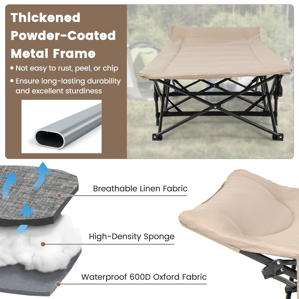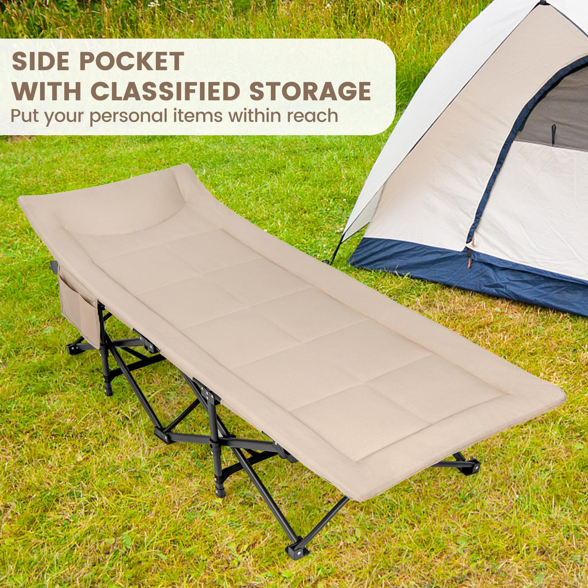 - Comfy Pad & Ergonomic Design: The padded camping cot features a breathable linen fabric surface and high-density sponge filling, providing ultimate comfort. Moreover, it features an integrated pillow with incline angle, offering added head and neck support for a restful sleep.