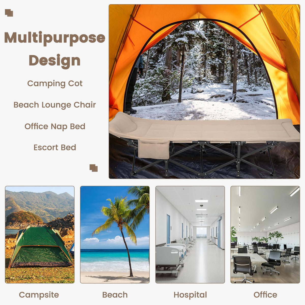 - Multipurpose Design: The cot is perfect for your outdoor activities, such as picnics, overnight stays at the beach, hiking, or camping, and you can also put it inside the tent to spend a comfortable night. Meanwhile, it can also be used as an office nap bed, a hospital escort bed, or a beach lounge chair.