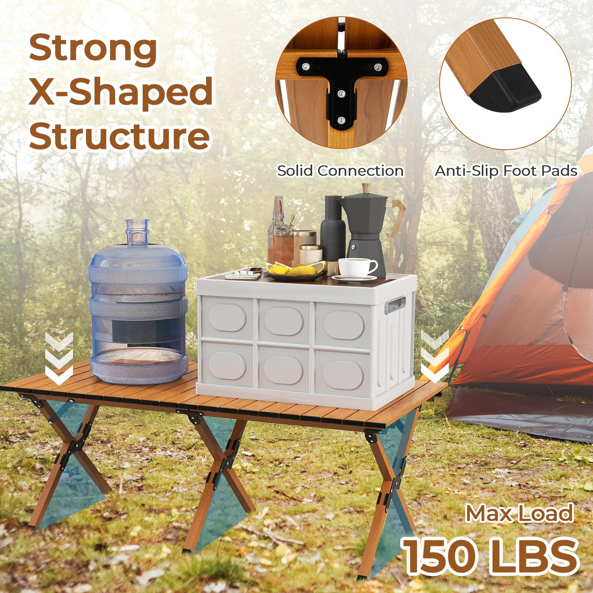 - Durable Aluminum Frame: The sturdy aluminum frame of this outdoor dinning table ensures stability and support, allowing it to withstand various terrains and weather conditions. The strong X -shaped structure can support up to 150 lbs without shaking or wobbling.
