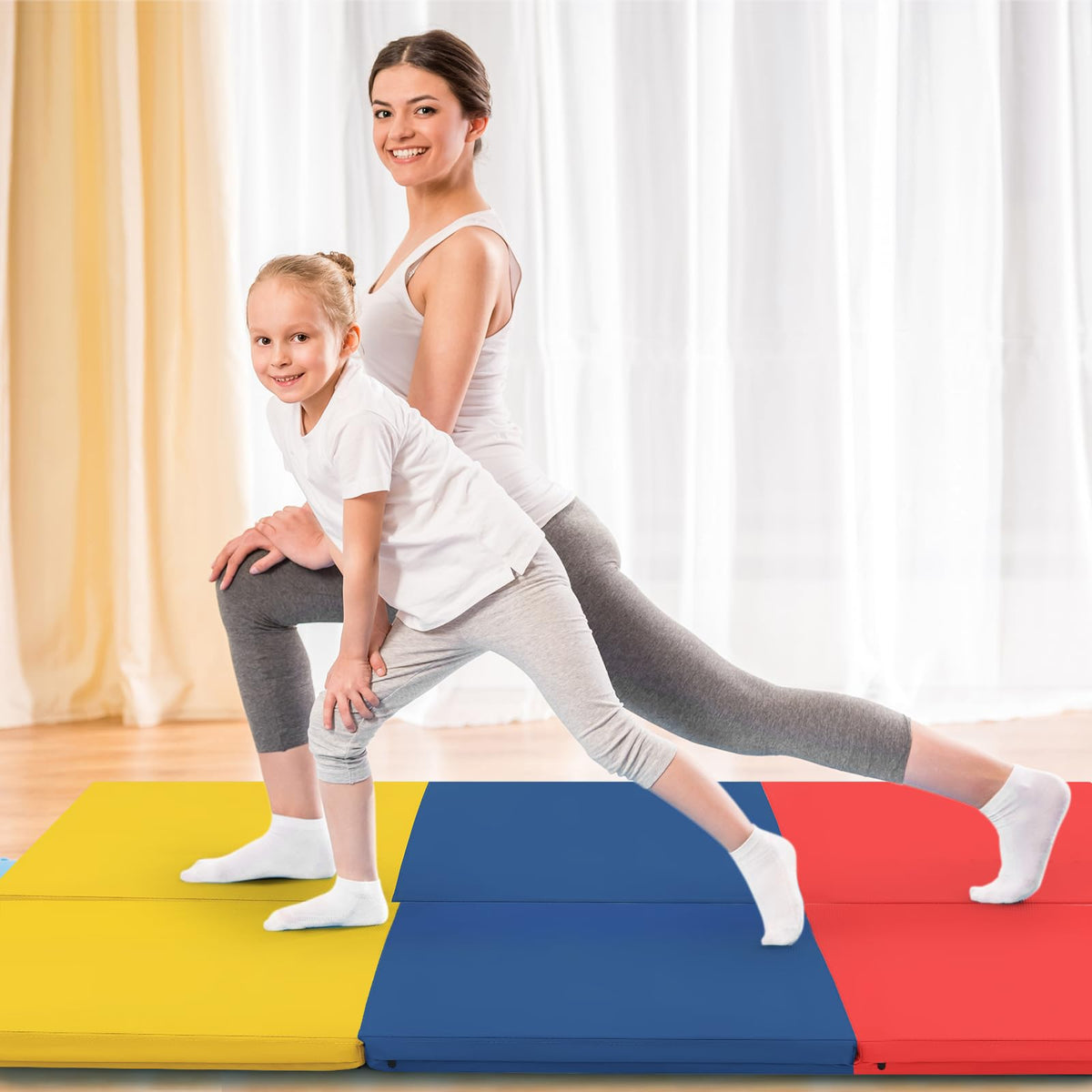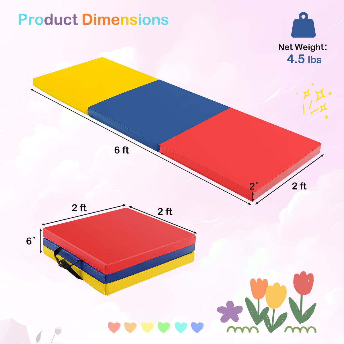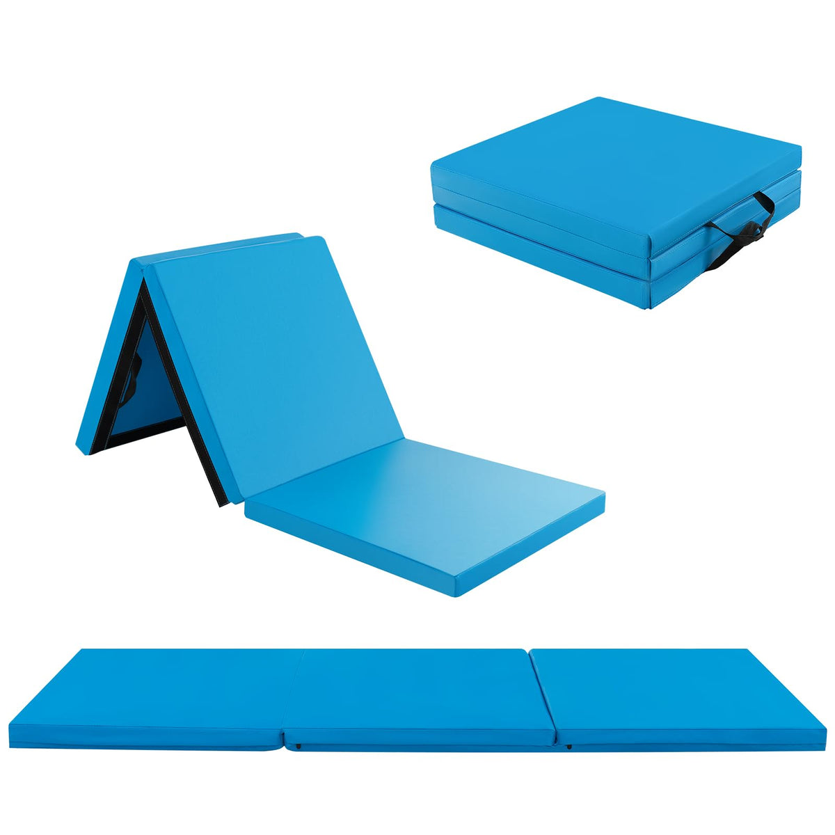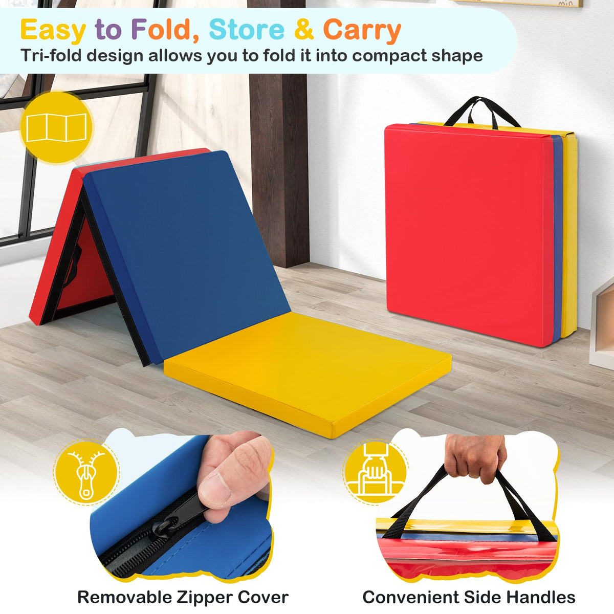 - Easy to Fold, Store & Carry: The tumbling mat boasts a convenient and space-saving tri-fold design, allowing for easy storage after use. When folded, it measures 24" x 24" x 6" (L x W x H), which is compact and portable. The gym mat is equipped with two carry handles, ensuring effortless transportation.