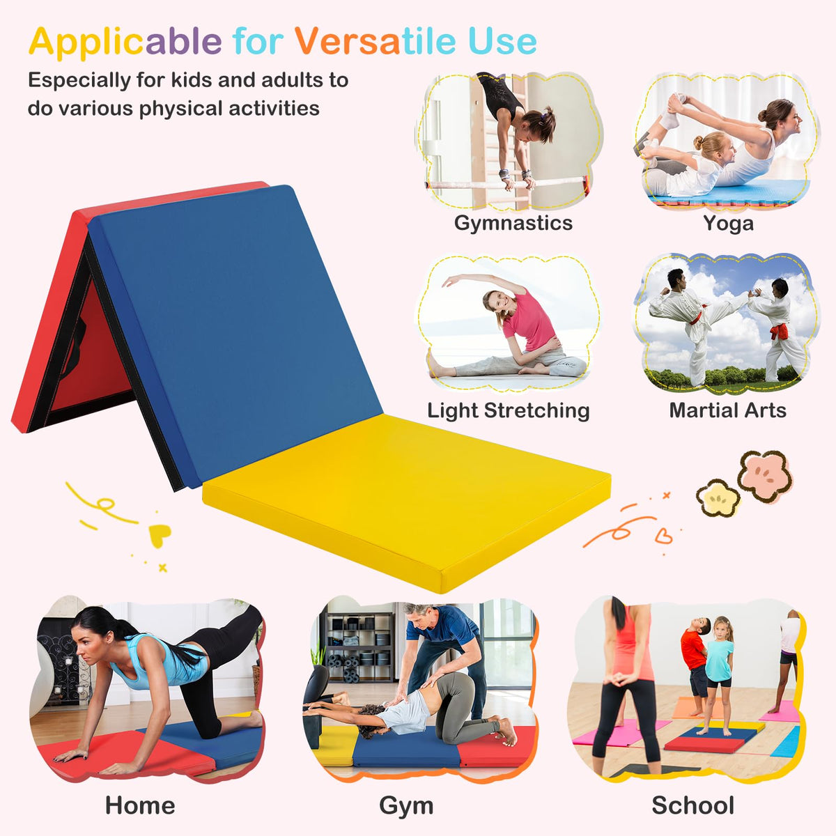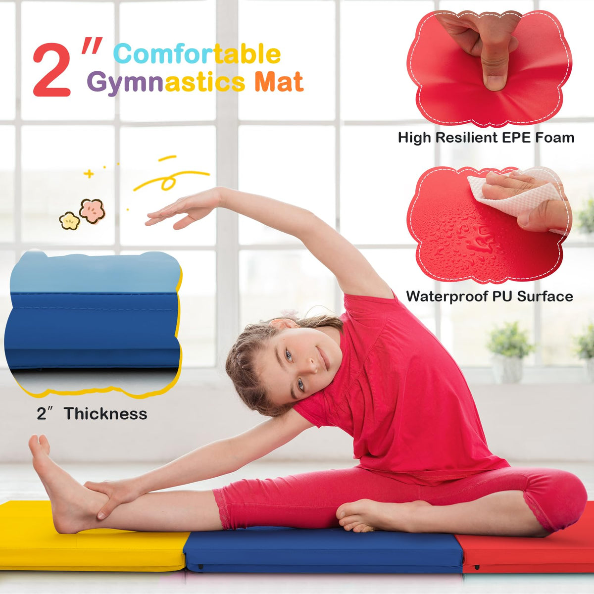 - Thick & Non-Deformable Gym Mat: The folding gymnastics mat is padded with 2” thick EPE pearl cotton, which is non-deformable and offers firm support to your body comfortably during gymnastics. You can exercise tumbling skills, yoga, stretching,stretching and daily exercise at ease.