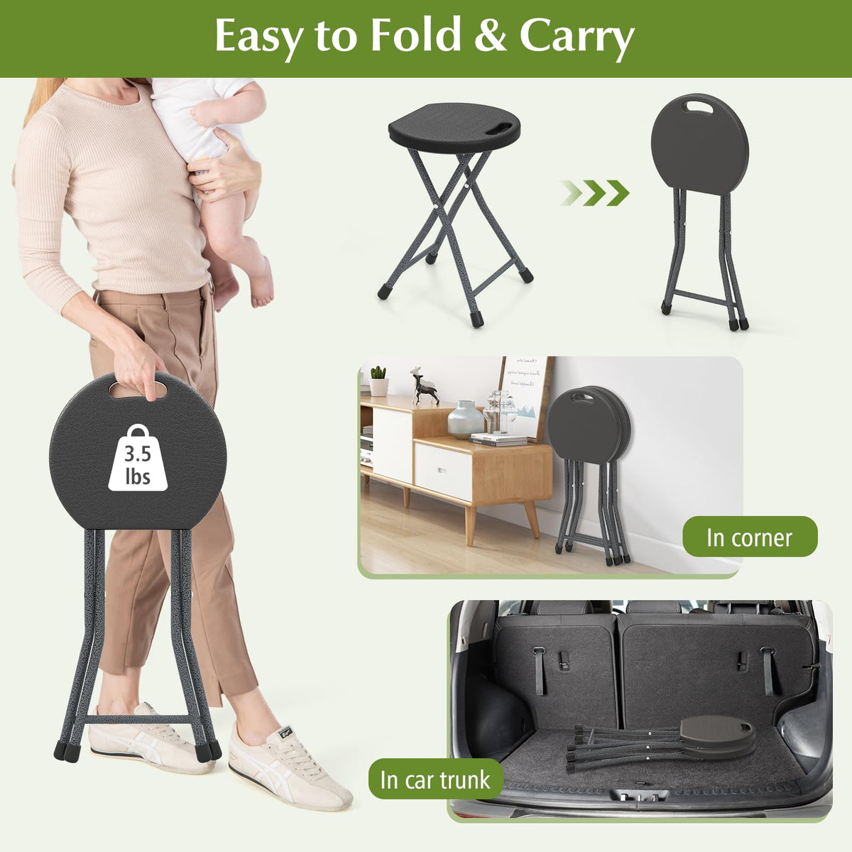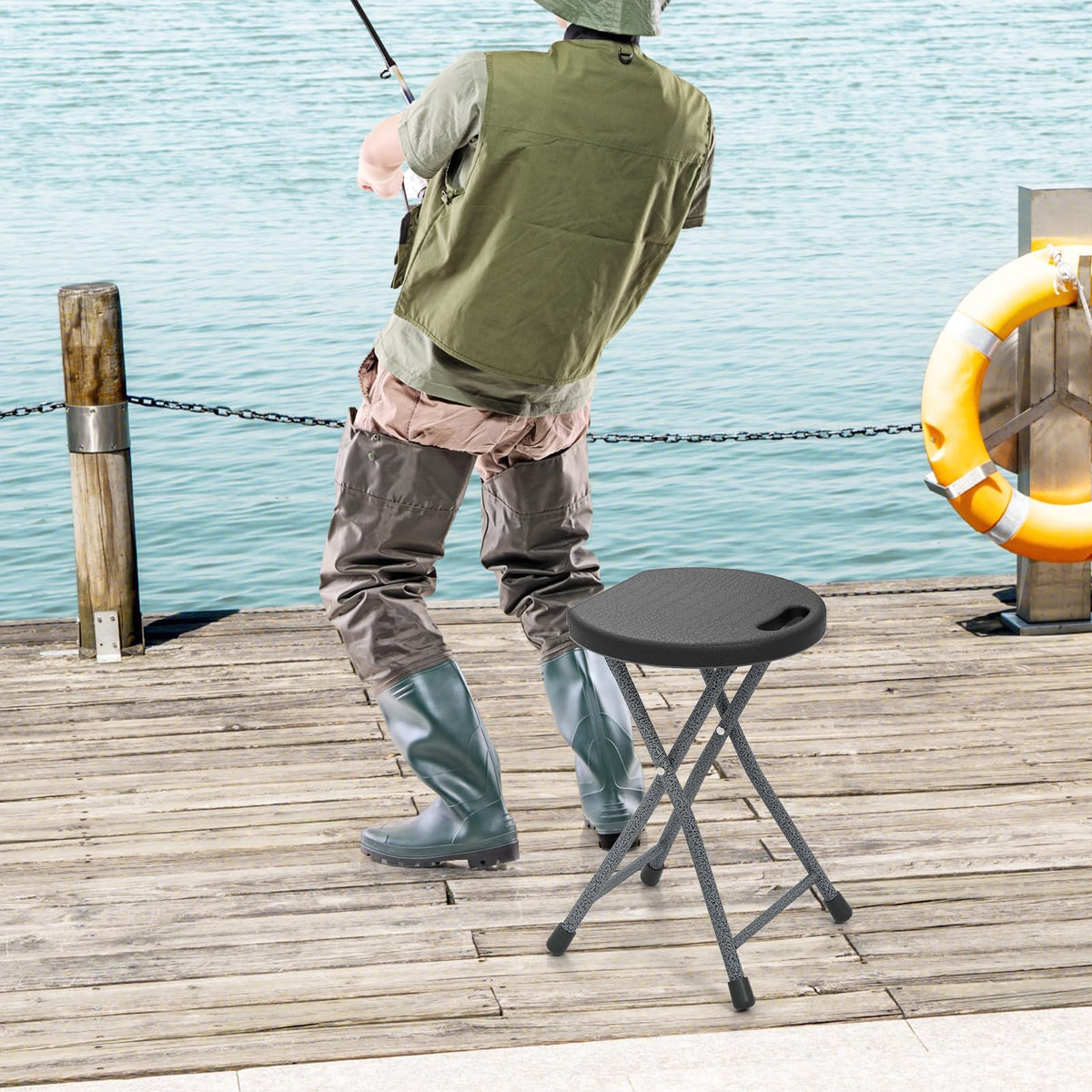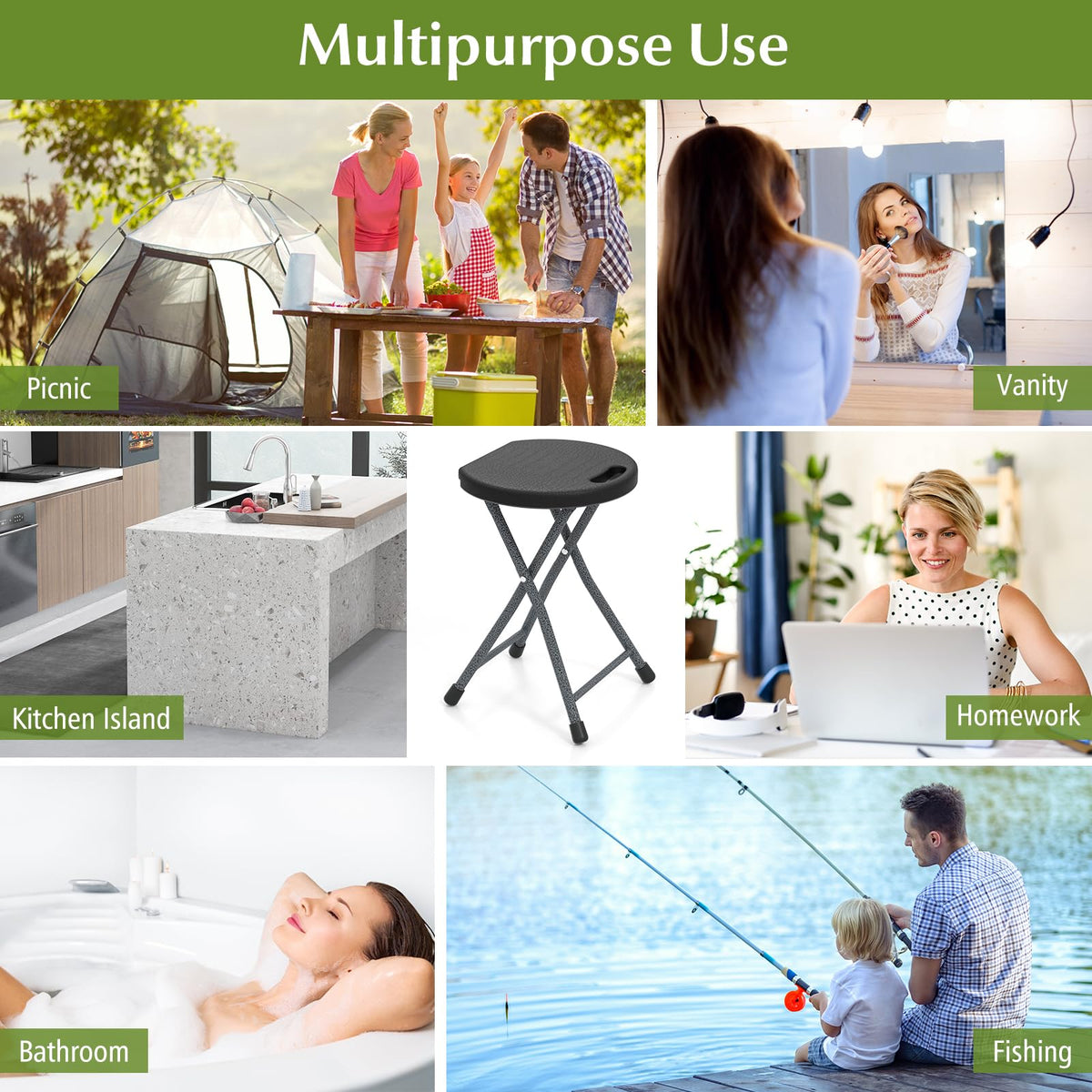 - 【Multipurpose Stools】This backless stool is suitable for various indoor and outdoor scenarios. Working perfectly in kitchen or beside bar table to avoid long-time standing, this bar stool can be served as a spare chair, a small table, a chair for music instrument playing, a shower chair. Moreover, with folding design and handle, this portable stool is also suitable to store in your RV or trunk and offer seat for any outdoor activites, such as camping, picnic and fishing.