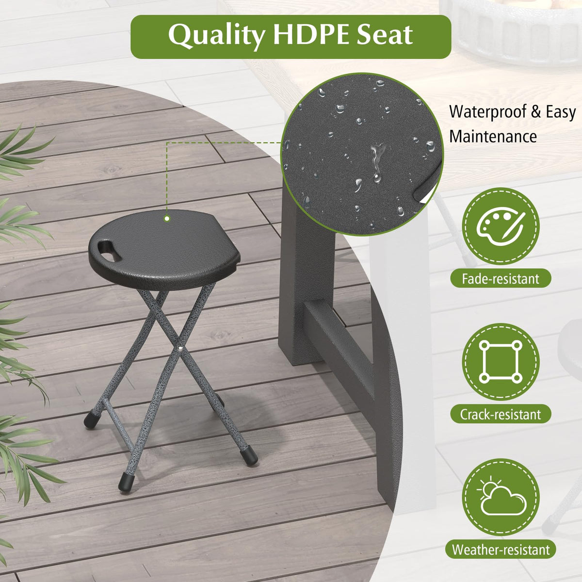 - 【Comfortable Sitting & Easy Maintenance】The 10.5" x 11.5" spacious seat offers ample supporting area, and you are also free to put cushion on seat for a more cozy seat. And the crossbars allow you to rest you feet if needed. Made of premium HDPE material, the seat features smooth edges to prevent scratches and the waterproof surface is easy to clean with damp cloth.