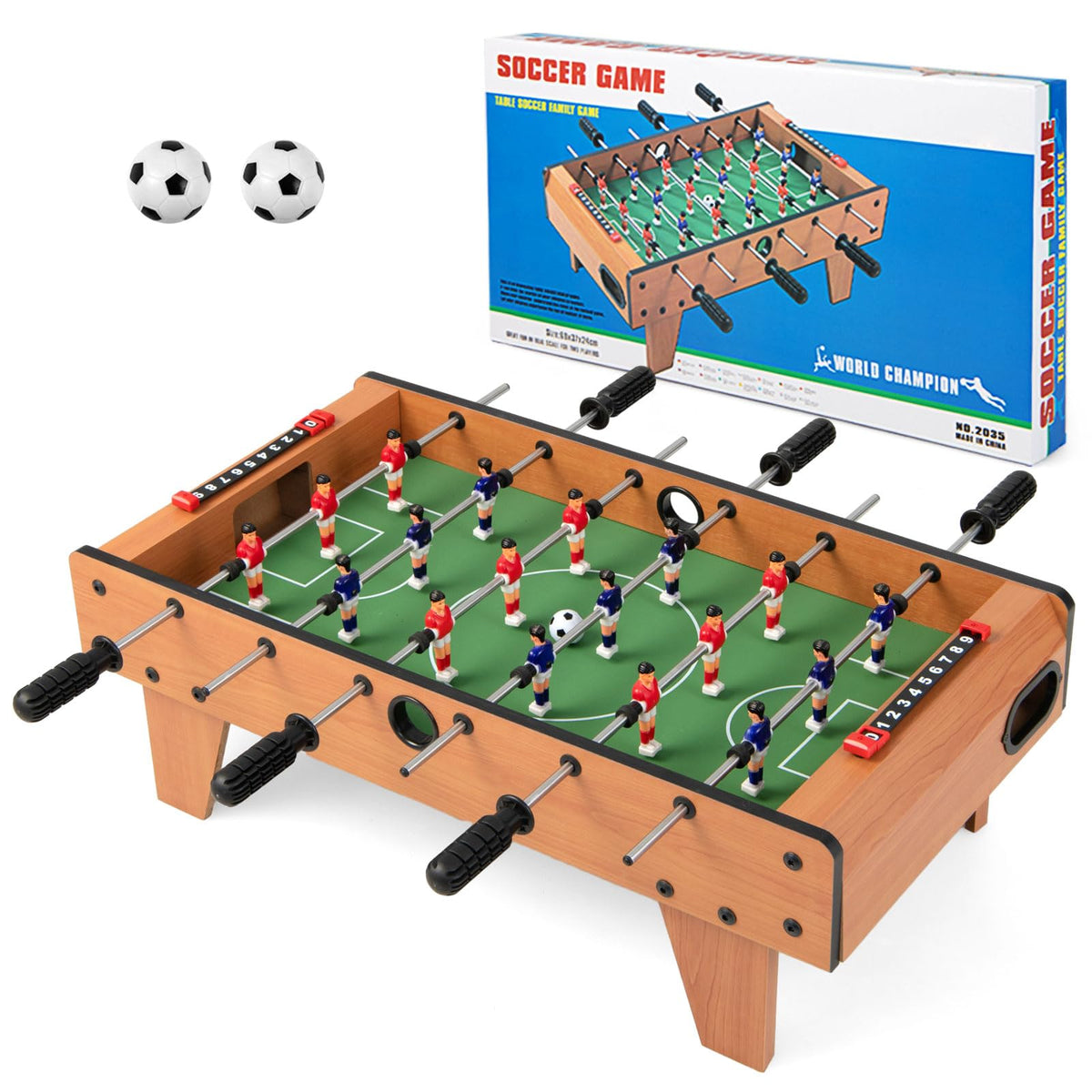 Looking for the ultimate tabletop foosball game experience? This compact and portable table brings the exhilarating fun to your families or friends. The set includes 2 footballs for endless gameplay, goal boxes for each team, and convenient kick-off holes for quick and easy starts. The smooth metal rods ensure swift and precise movements, while the non-slip rubber handles provide optimal grip and control. With manual scorers on each end, you can easily keep track of the score and intensify the competition. Packaged in a stylish gift package, it also makes for a fantastic present for sports enthusiasts of all ages.