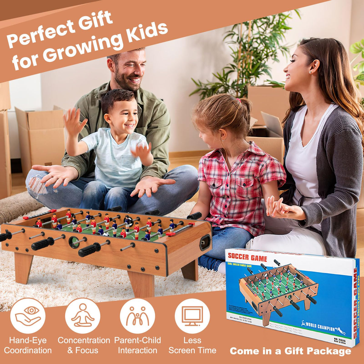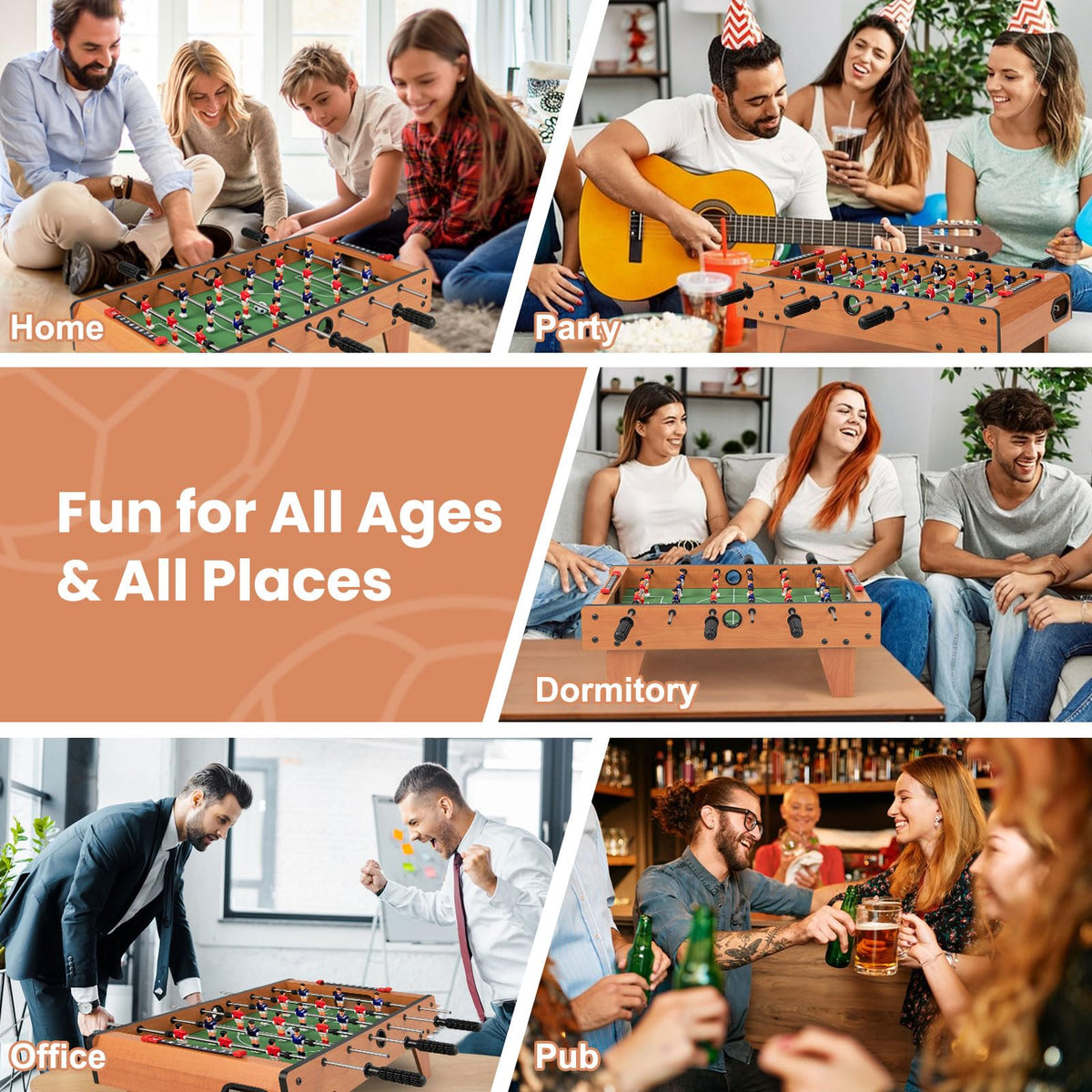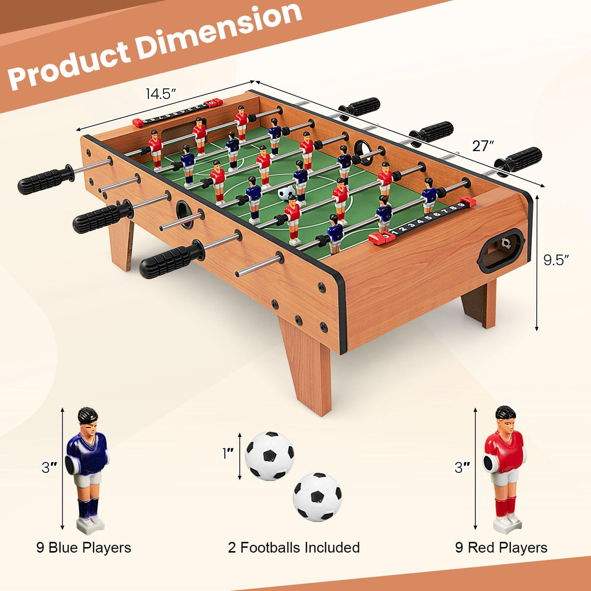 - Tabletop Foosball Game Table: This foosball game table is perfect for homes, offices, parties, dormitories, pubs and more, providing endless fun for both children and adults. Plus, its compact size allows for easy storage and transport. Product dimension: 27" x 14.5" x 9.5" (L x W x H).