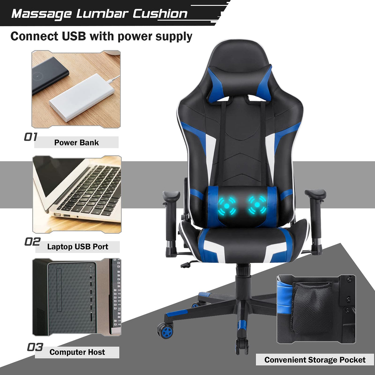- Ergonomic Design & Massage Function: Featuring a high back, thick padded seat and armrest with PU surface, this gaming chair can provide strong support and comfort for your whole body. Additionally, the chair comes with a headrest and massage lumbar pillow to relax your waist muscles, which can give you a super comfortable gaming experience.