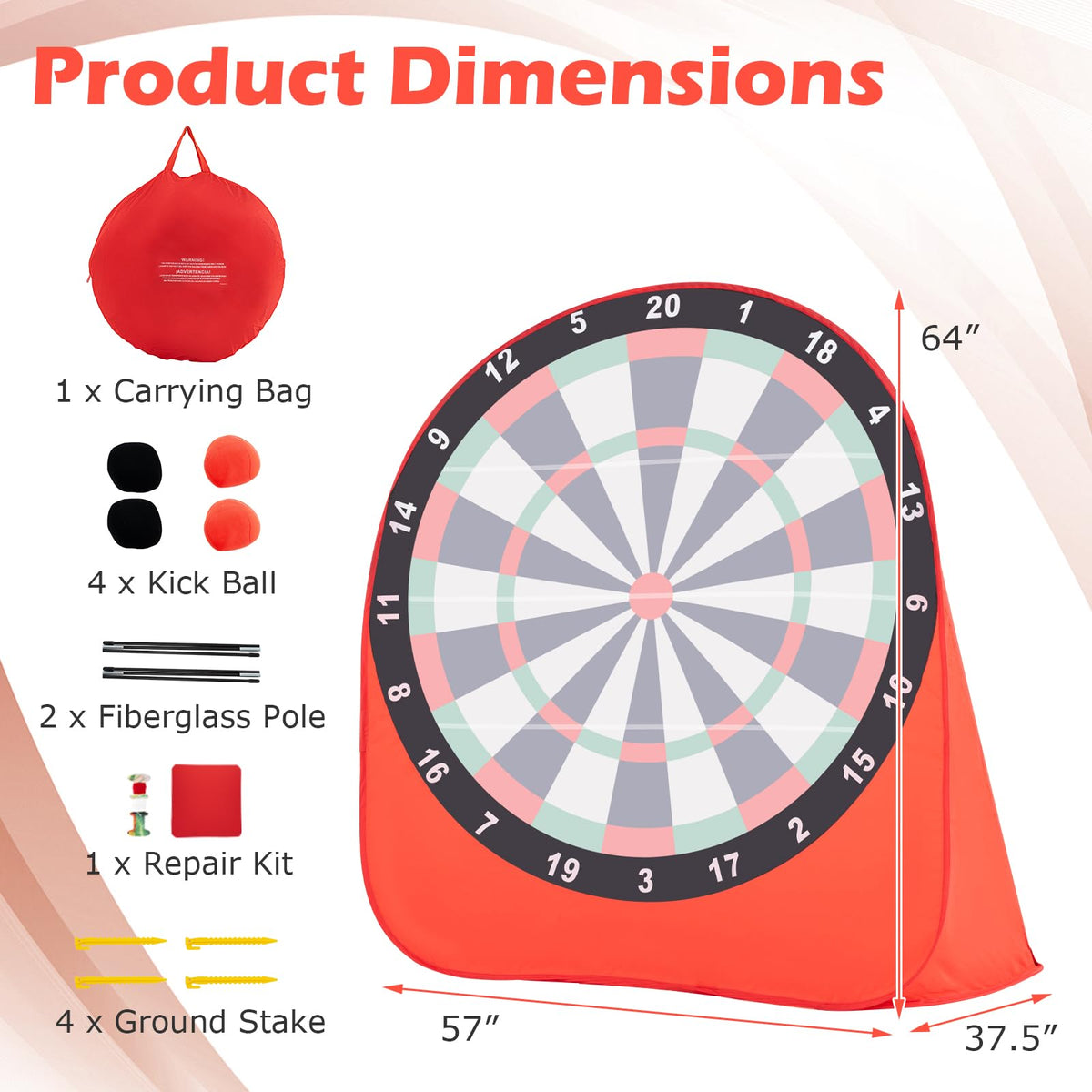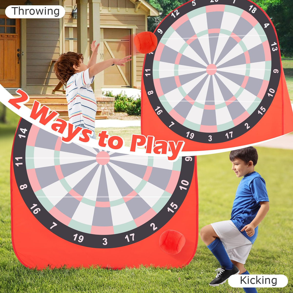 - 2 Ways to Play: Measuring 57” x 52” x 64” (L x W x H), this big dart board set offers two ways to enjoy the game, which are throwing and kicking, combining the fun of soccer and darts for endless entertainment.