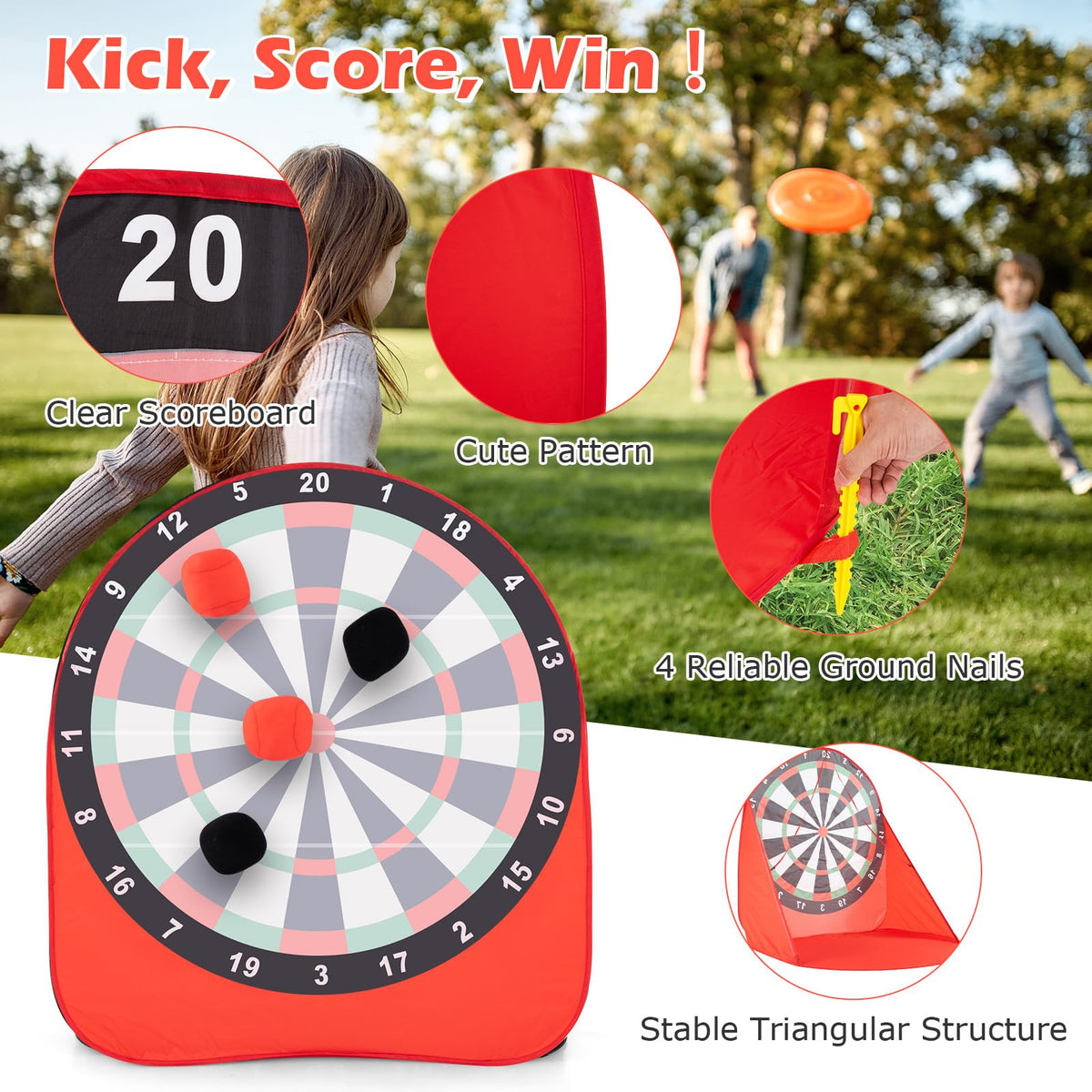 - Full Accessories & Ideal Gift: This dart game set is completed with a clear scoreboard, 4 reliable ground nails, 1 carrying bag, 4 kick balls, 2 fiberglass poles, 1 repair kit, and 4 ground stakes. It helps to encourage interactive play, promote physical coordination and can be a perfect gift for kids aged 6+ years old.