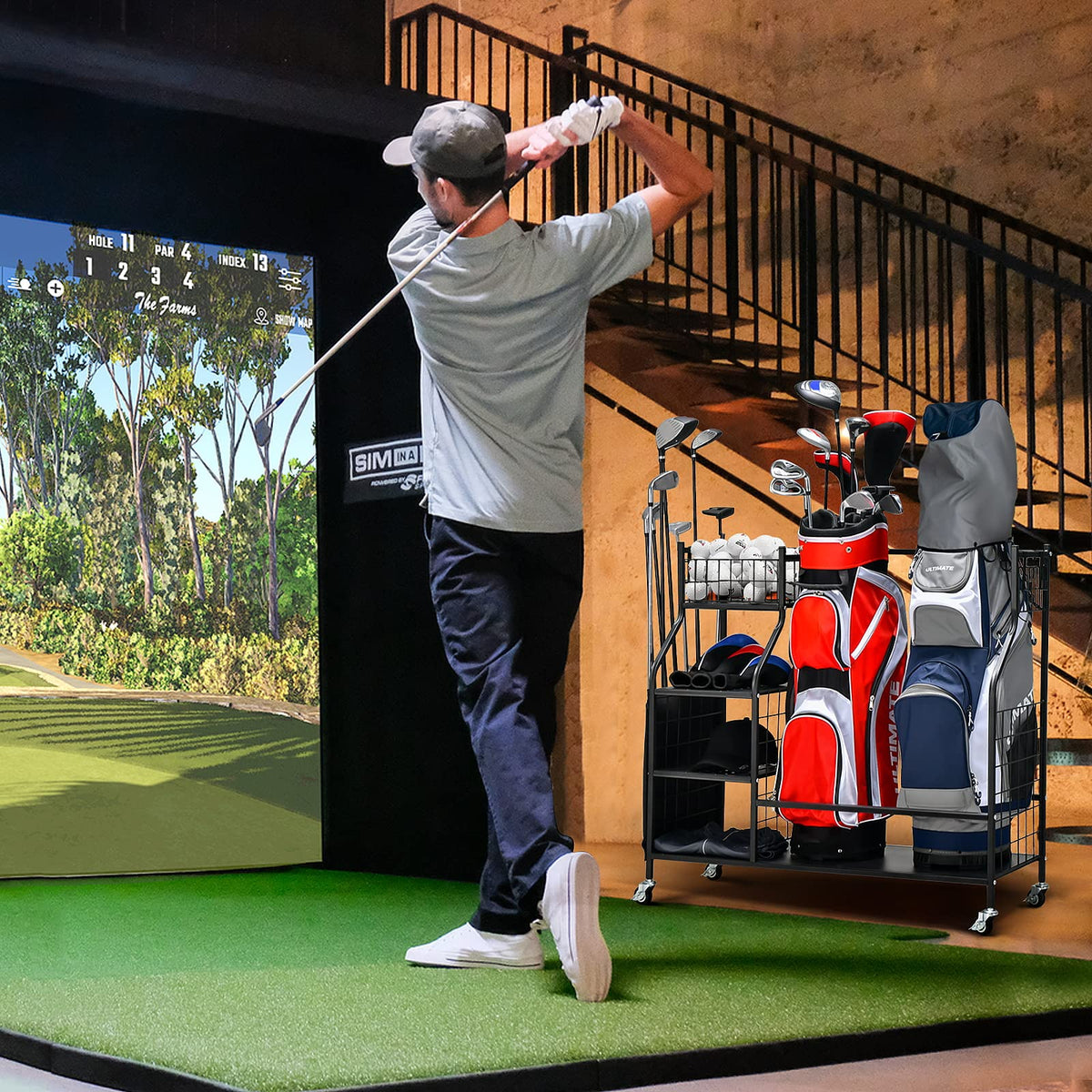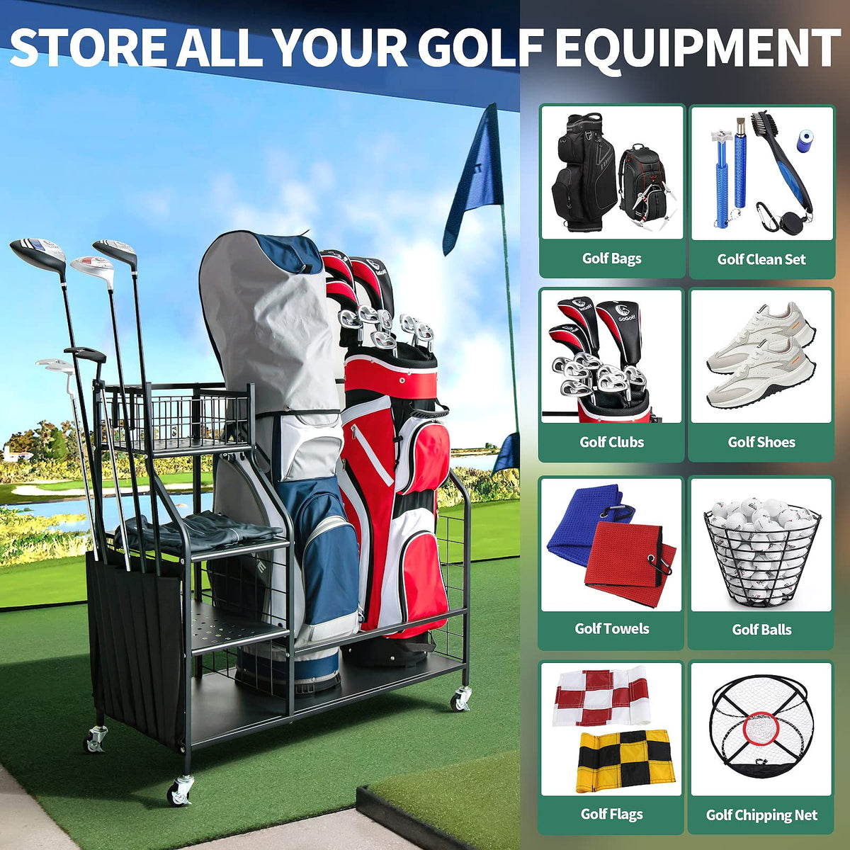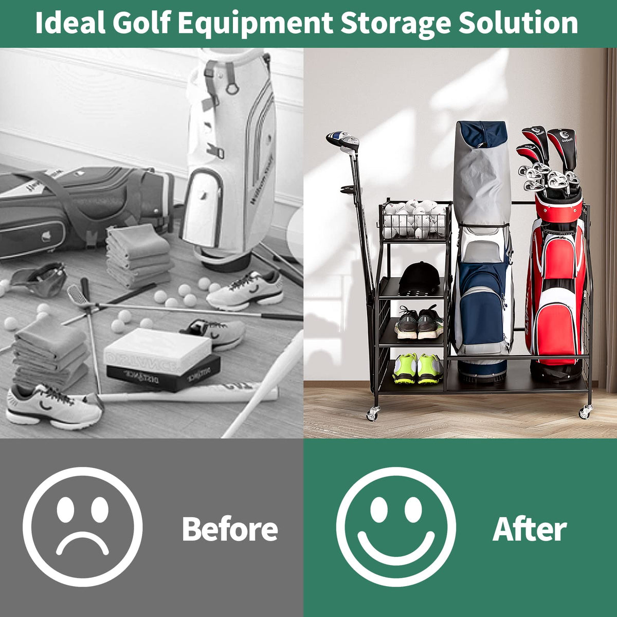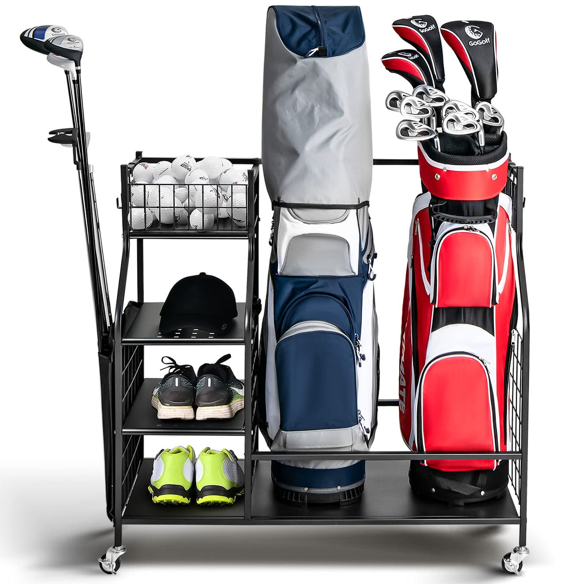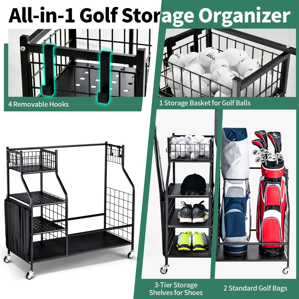 - All-in-1 Golf Storage Organizer: Equipped with a 3-tier storage shelves for shoes/golfing cap, 1 storage basket for golf balls and a large compartment for 2 standard golf bags, GYMAX golf storage rack is able to store all your golf equipment and accessories.