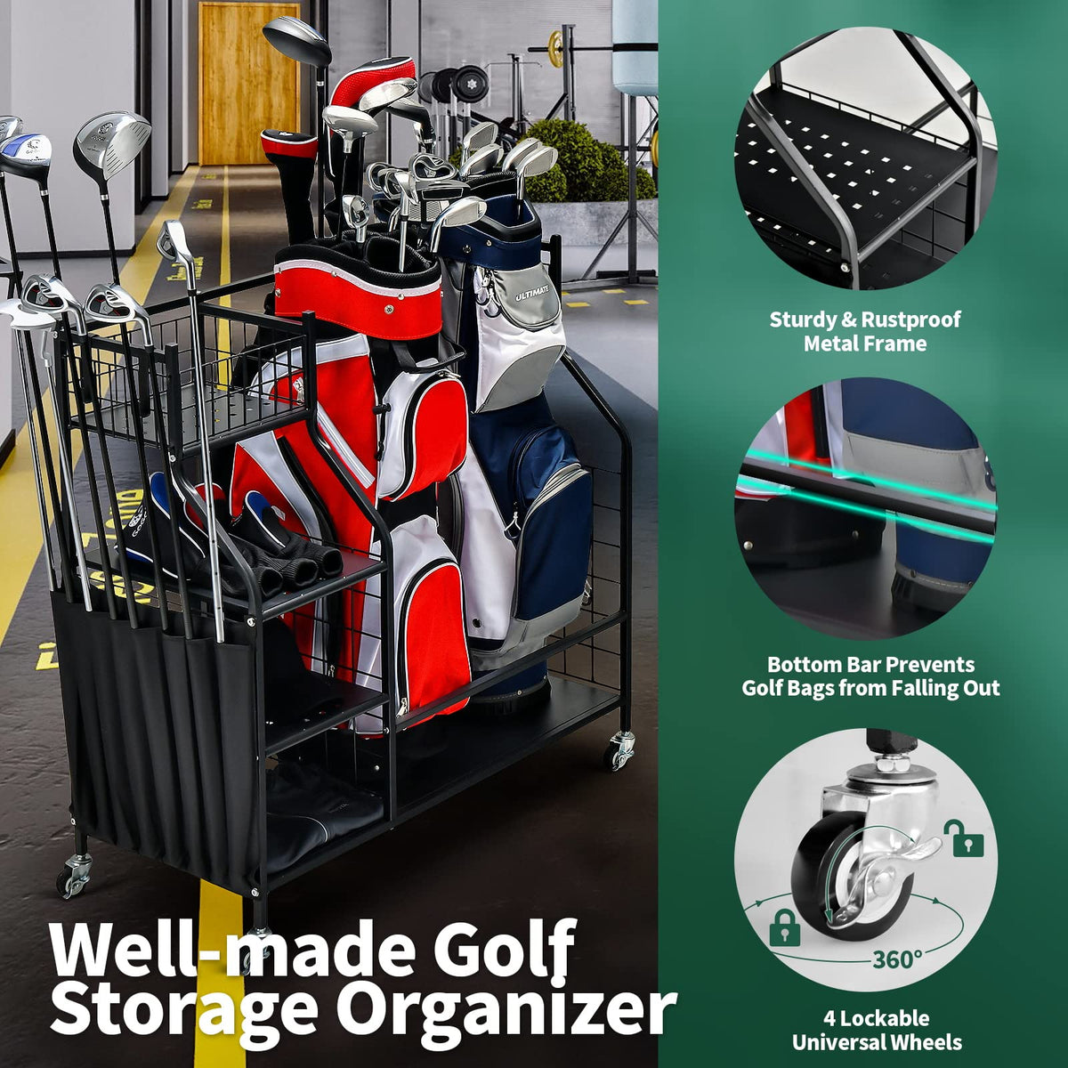 GYMAX Golf Bag Organizer, Golf Storage Garage Organizer with Lockable Wheels & Golf Club Side Pockets