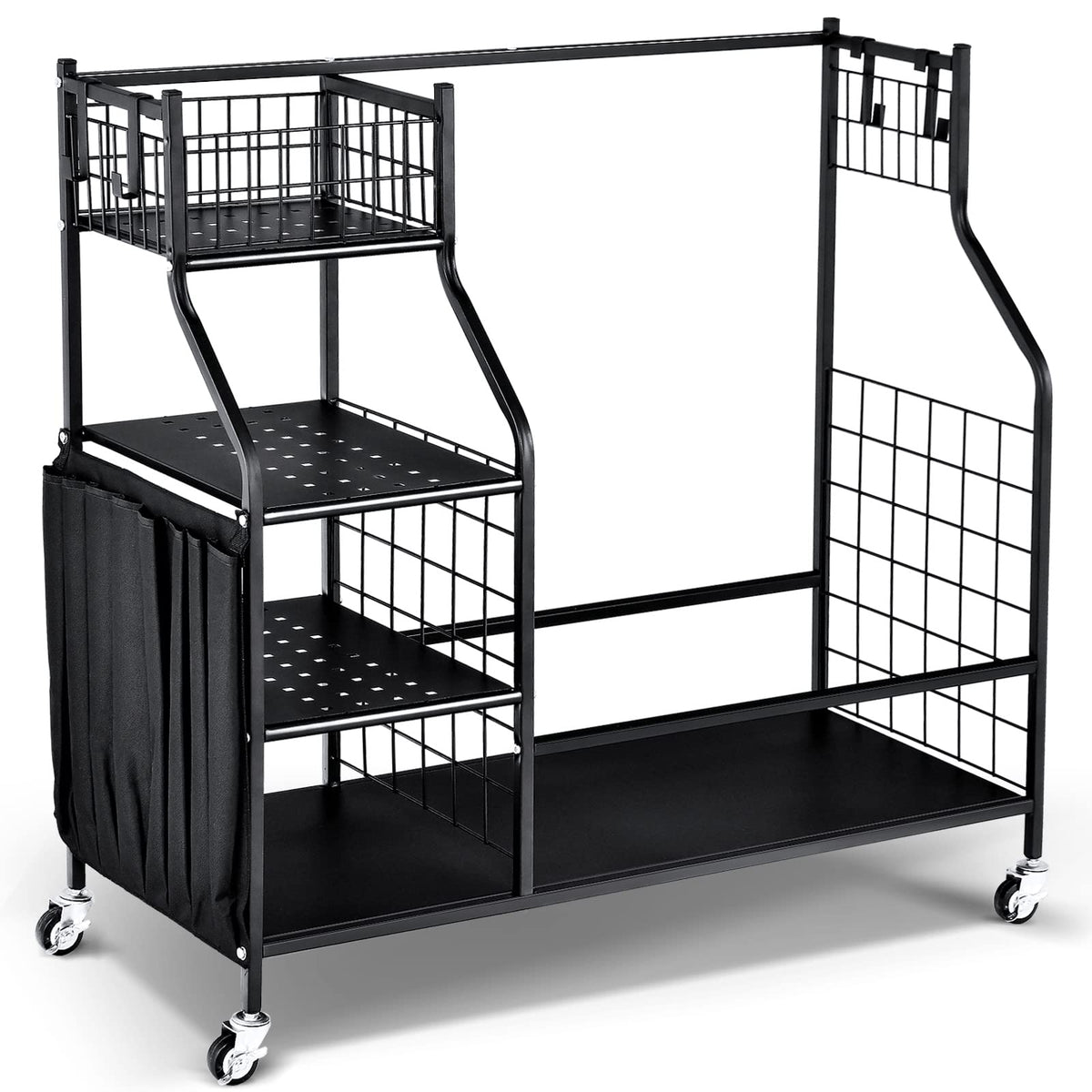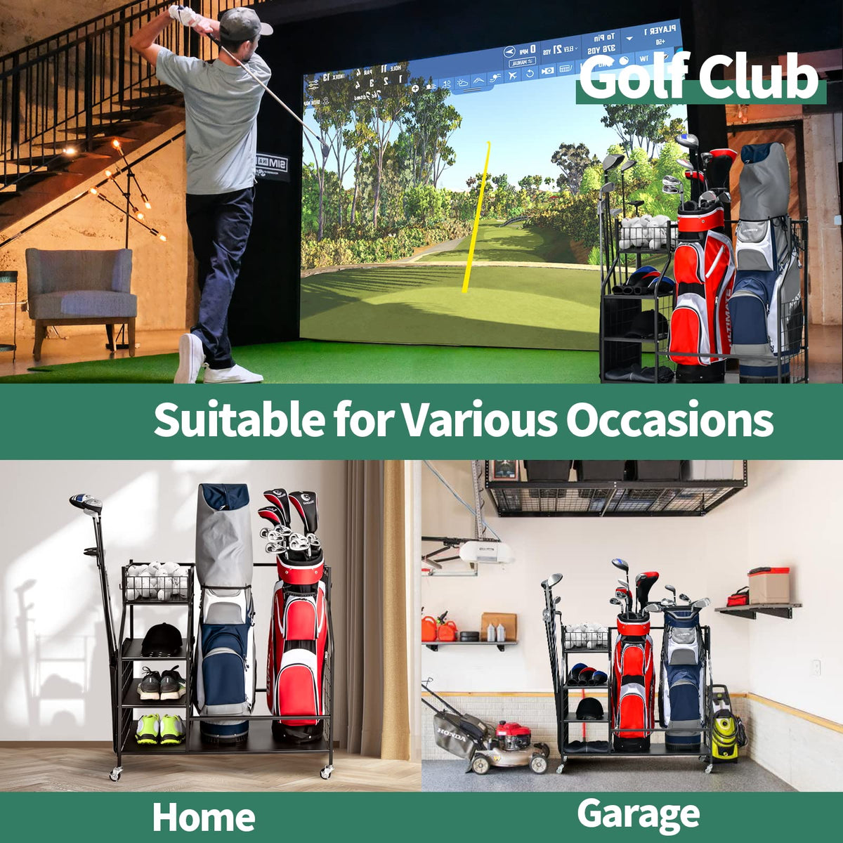 - Easy Movement & Lockable Wheels: Equipped with four 360° swivel wheels, this golf bag organizer rack can be easily moved to anyplace you want. What's more, you can lock the wheels to prevent the golf bag storage rack sliding when you stop it.