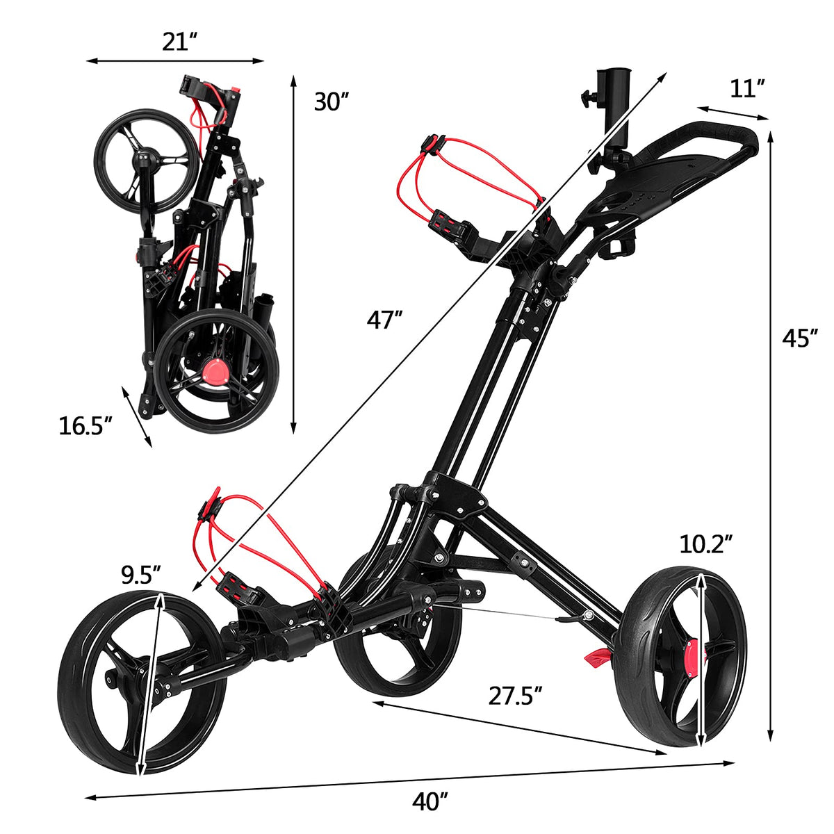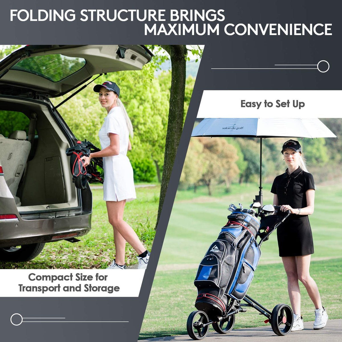- 【Folding Design for Maximum Convenience】 The golf cart can be quickly folded into a compact size, which only measures 16" x 21" x 30". Within 3 steps, the folding process is done, effortless and convenient. Certainly, the lightweight cart with detachable wheels meets all your needs for easy transport and storage.