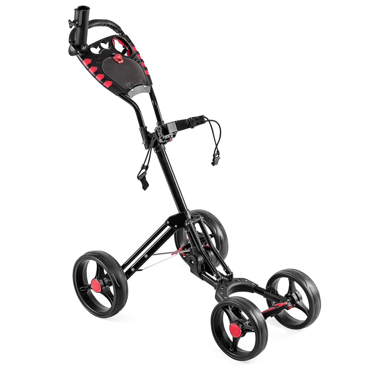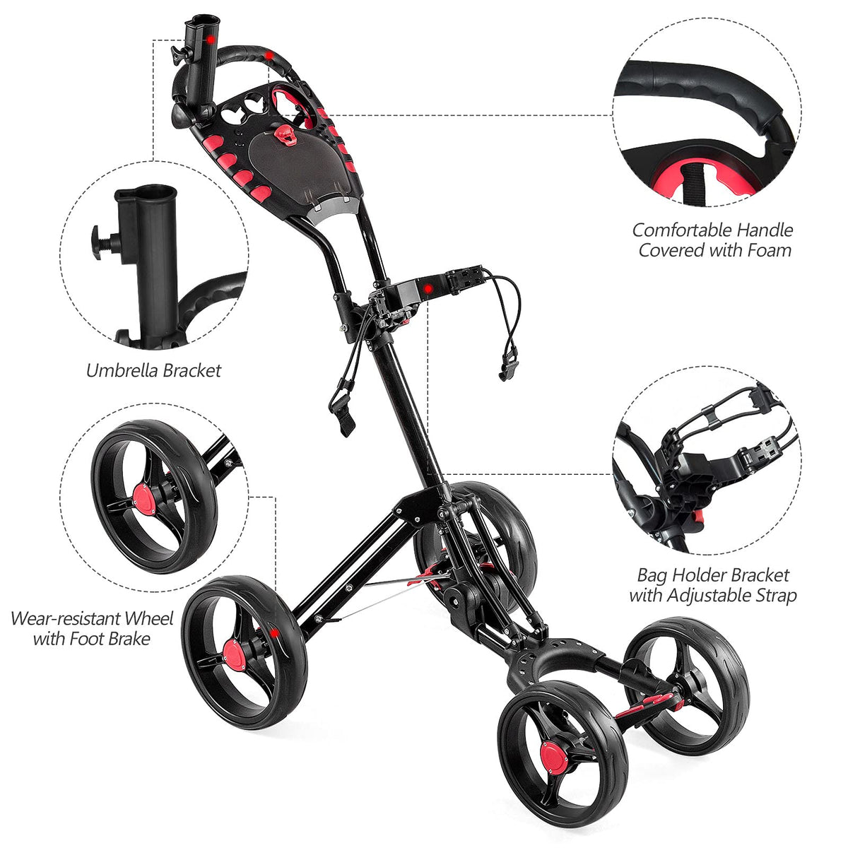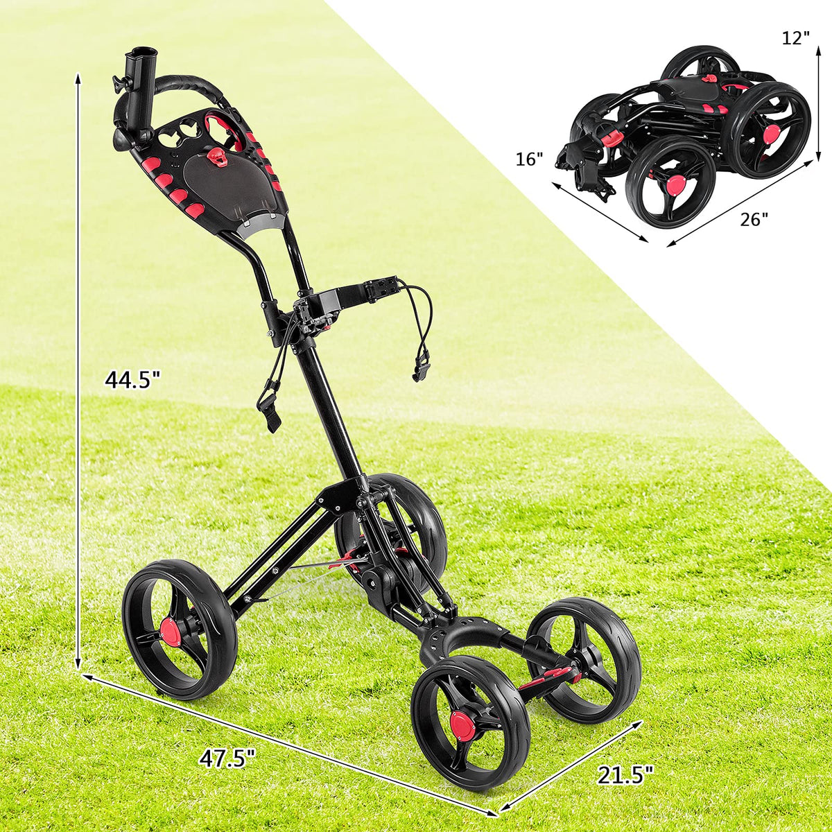 - 【Foldable Design】GYMAX 4 wheel golf cart can be simply folded to a compact size for convenient storage and carrying in seconds, so you can put it in your boot or any corner at home. This golf cart is built with a super strong, lightweight and sturdy aluminum frame, which makes it durable and stable.