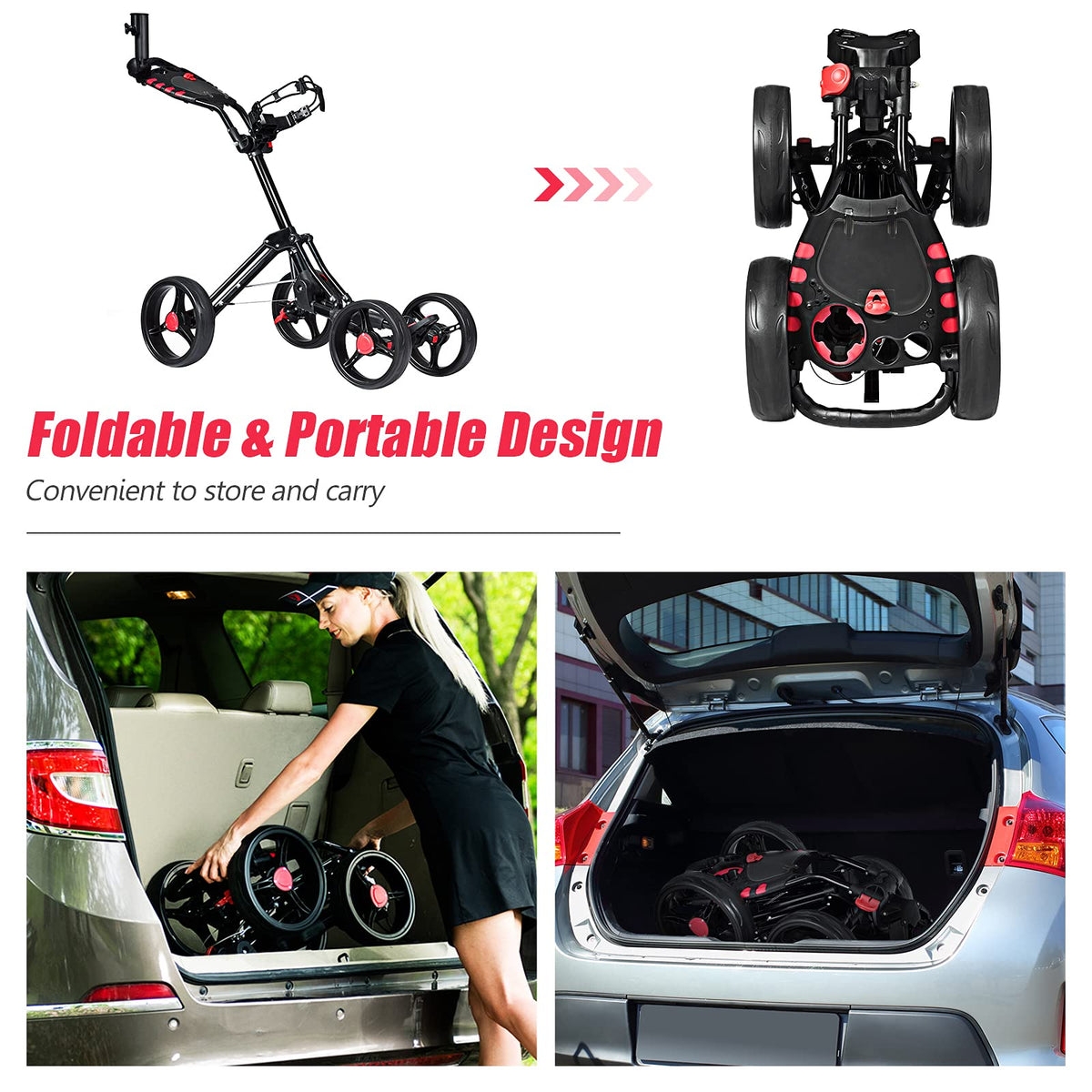 GYMAX Golf Push Cart, 4 Wheel Folding Lightweight Push Pull Cart Trolley with Drink Umbrella Holder & Scorecard