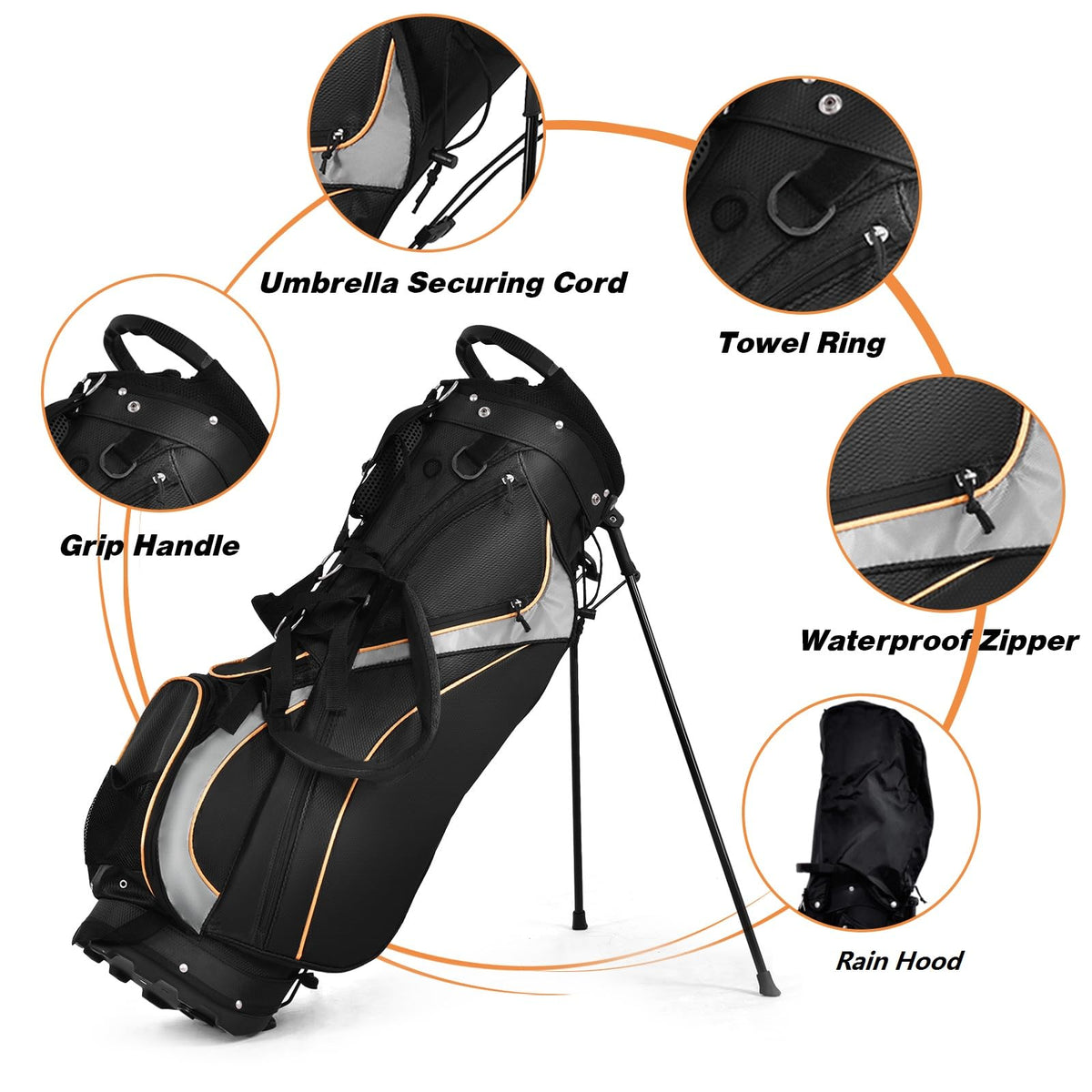 - Organized Storage Design: In addition to clubs, this stand golf bag also holds your personal items and keeps them orderly. It is equipped with a heat-insulated pocket for cold drinks and a large-size pocket for personal items, such as keys and wallets. And there are also umbrella cord and tower/glove ring for towels outside of the bag.