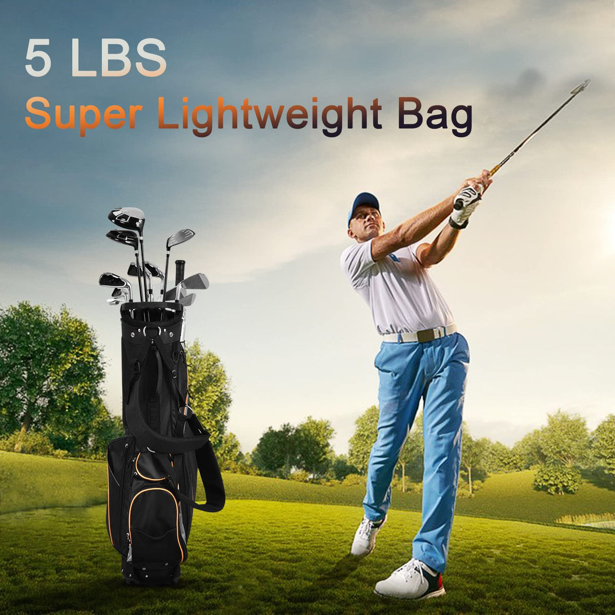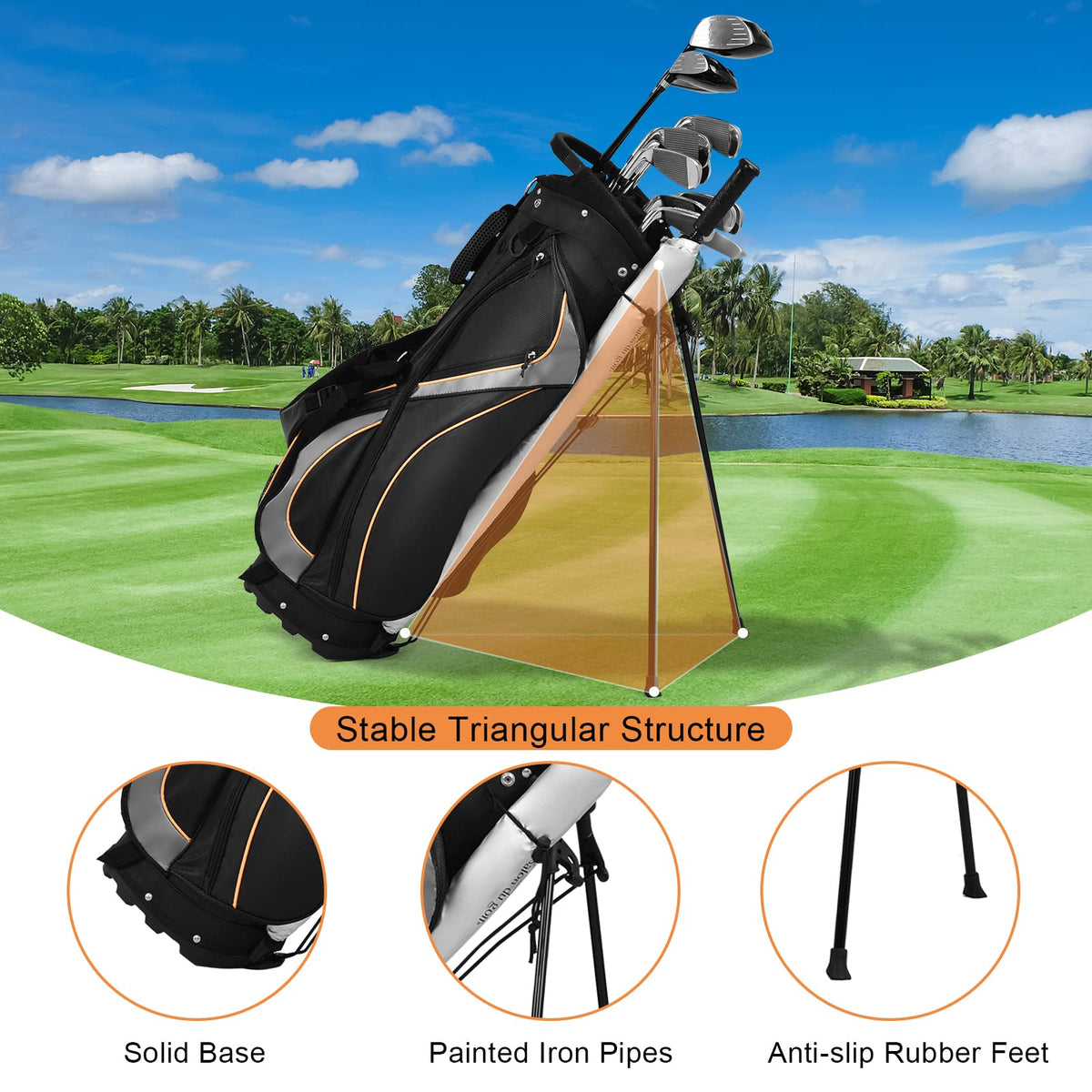 - Perfect Standing Golf Bag for Golf Lovers: The free-standing golf bag can be set up firmly alone on different terrains, leaving no worries when play golf. And the metal pipes are fitted with non-slip rubber feet for better stability.
