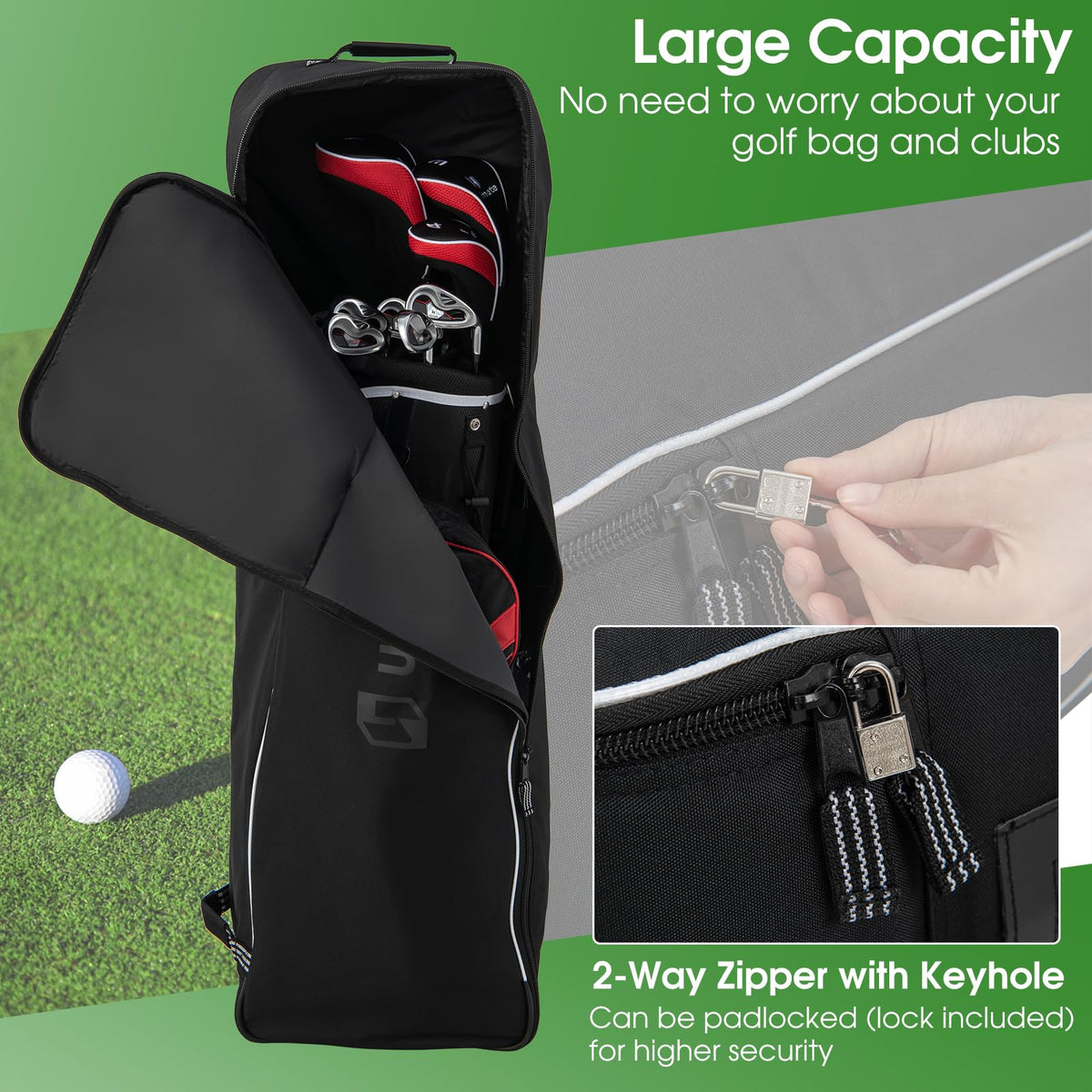 - Large Capacity: Measuring 15" x 10" x 49" (L x W x H), this golf club cover fits most golf bags. Smooth and half-surround zippers make it easy to put your golf bag in.