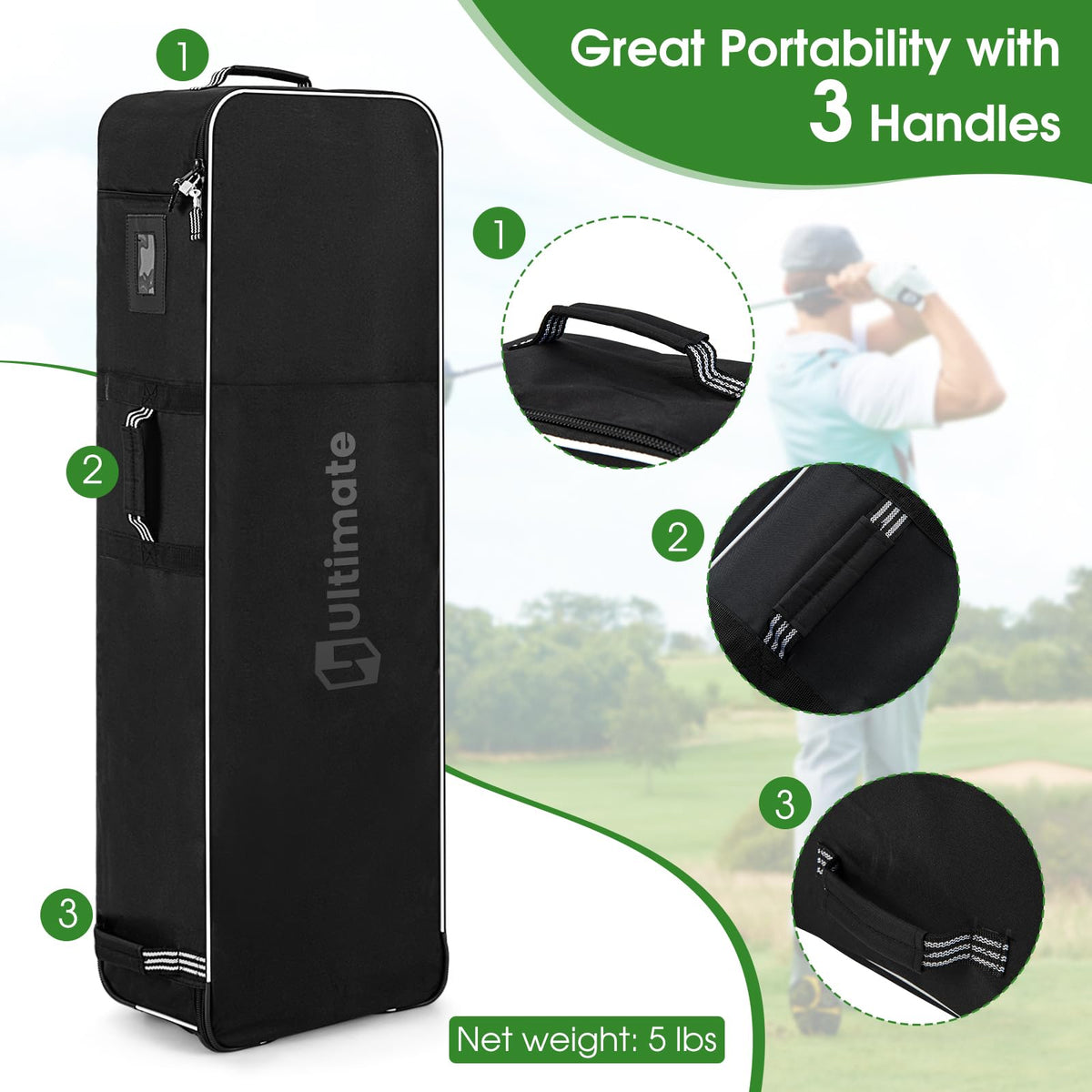 - Built-in Wheels & 3 Handles: Featuring 2 rolling wheels and weighing less to 5 lbs, this golf travel cover is effortless to pull. Meanwhile, 3 handles offer you more choices of holding this golf travel case.
