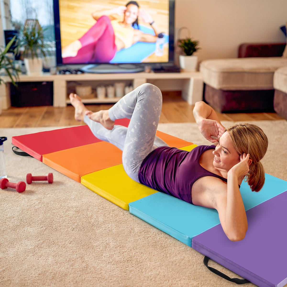 - Space-saving & Portable: Featuring a compact 5-panel folding design, this exercise mat is a convenient fitness accessory for small spaces. Moreover, it is lightweight at just 5 lbs and comes with convenient handles for easy transportation and portability, making it ideal for fitness enthusiasts.