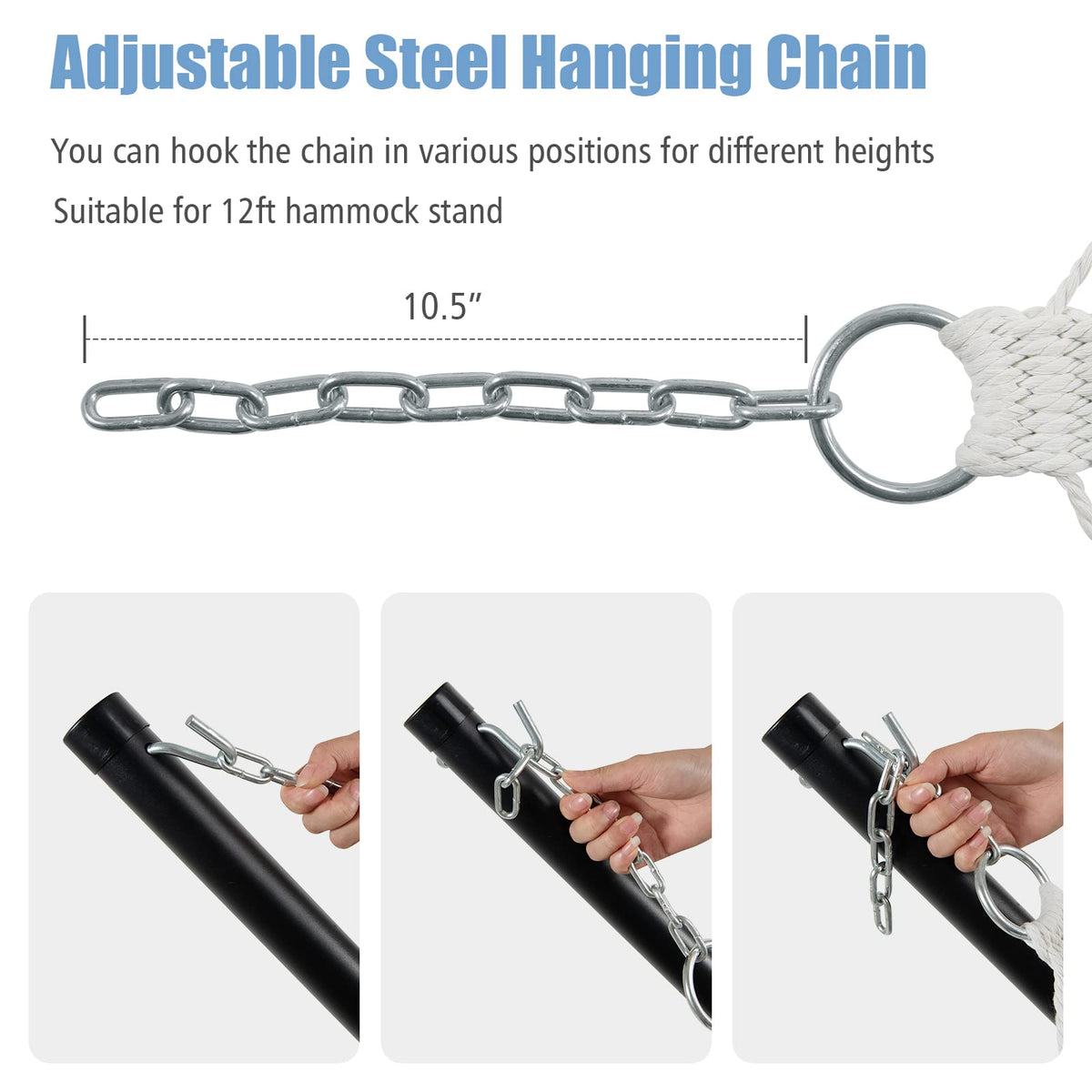 - Easy Installation: The hammock comes with sturdy steel hanging chains and hanging rings. And you can hook the chain in various positions for different heights. The installation is quite simple: connect the spreader bar, hang the hammock on the stand and then you can relax on the hammock. The hammock can be also hanged to the trees.