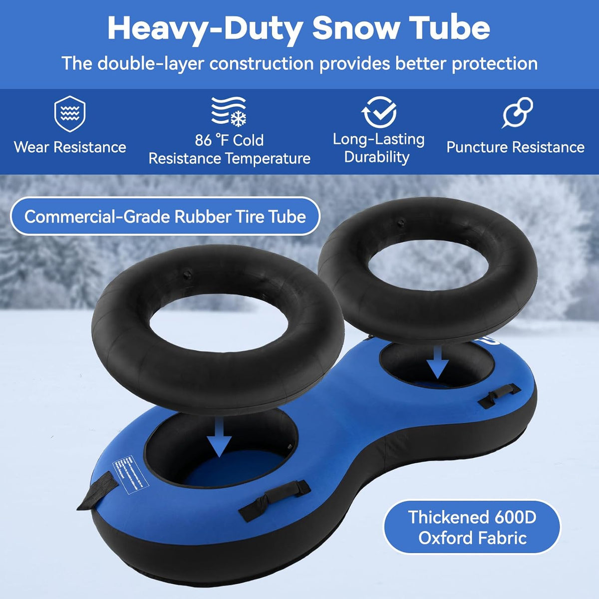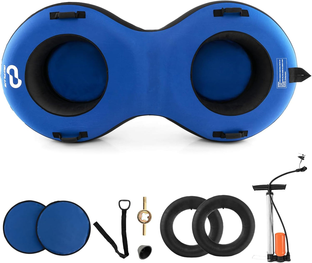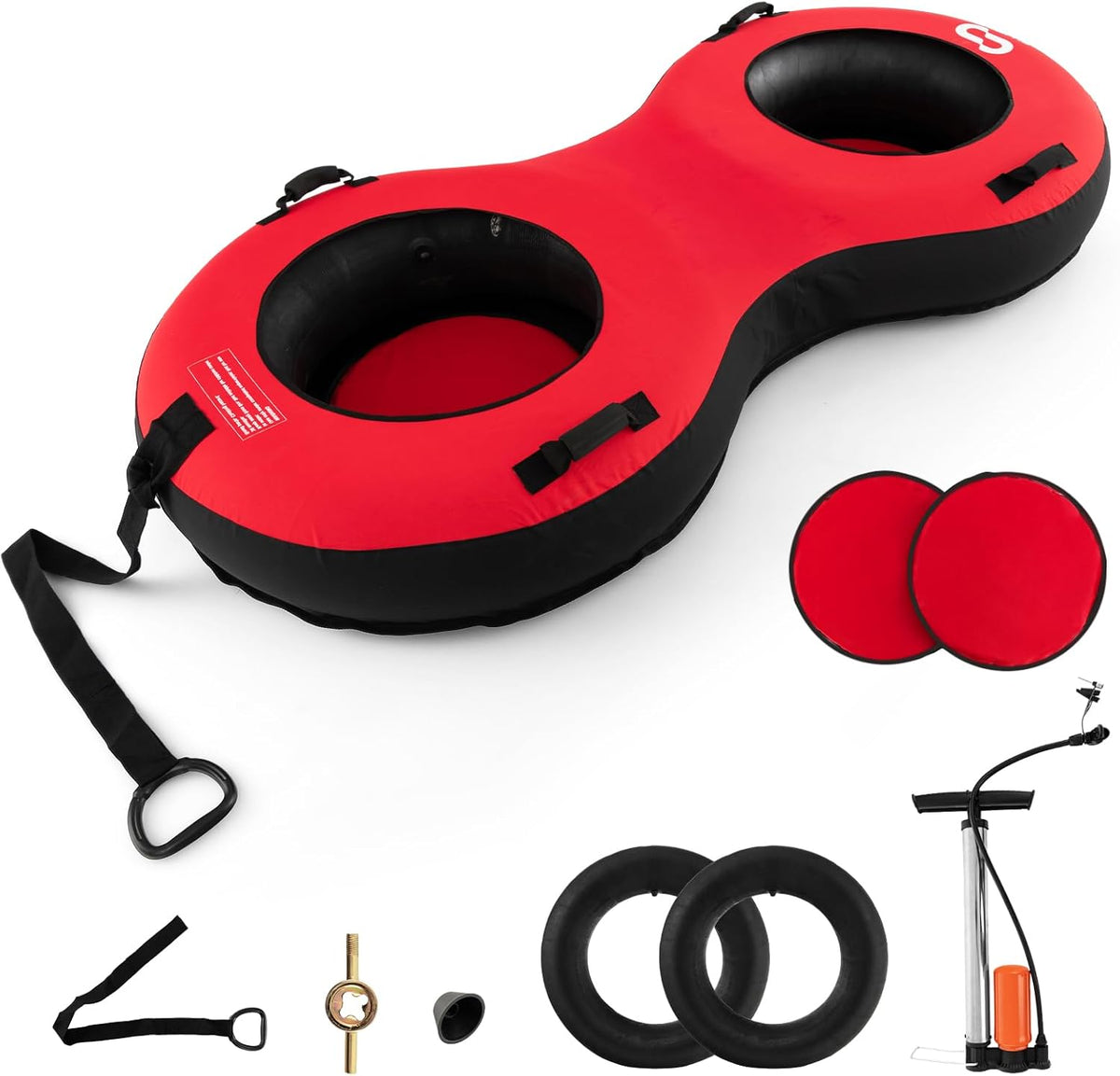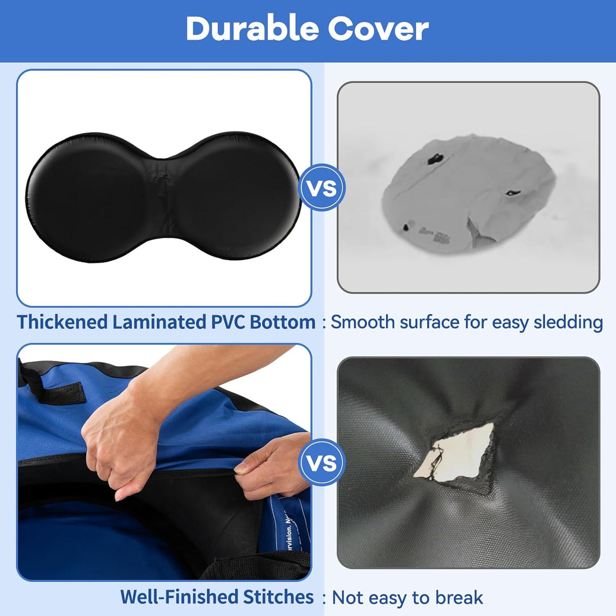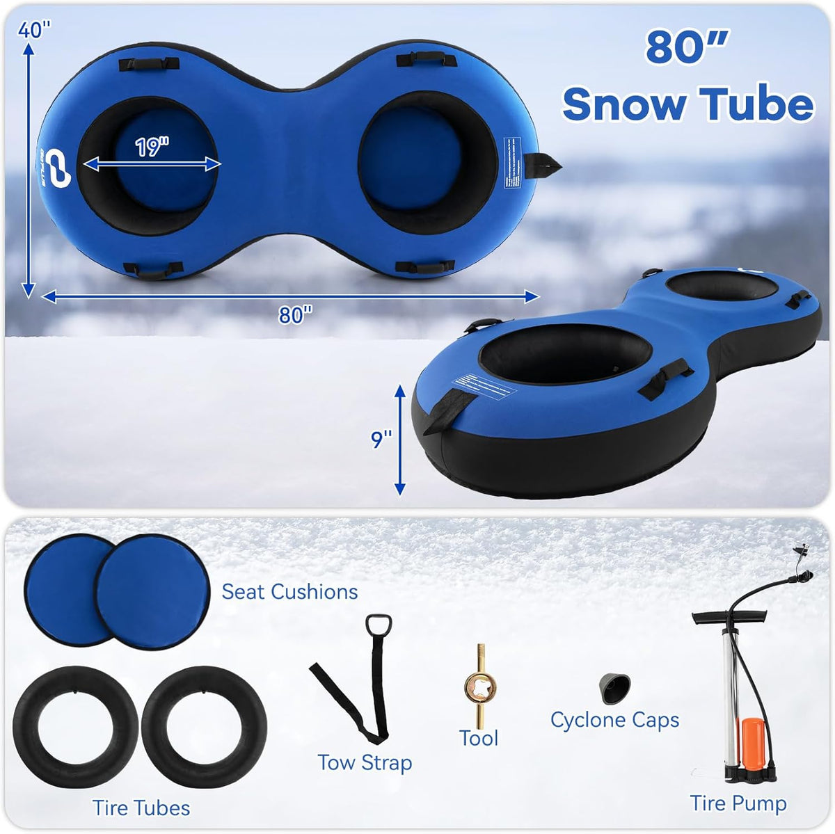 The 40” heavy-duty snow tube comes with a durable canvas cover that consists of thickened 600D Oxford fabric and hard bottom, which provide better protection against harsh weather conditions, ensuring long-lasting durability. The slick hard bottom also ensures maximum speed as you glide down the slopes. Besides, the inner layer adopts a rubber tire tube, ensuring good strength and excellent puncture resistance. Plus, the included tow strap makes it convenient to pull the tube uphill, so you can focus on having fun rather than lugging it around. Furthermore, inflating and deflating the snow tube is a breeze with the included tire pump and leak-proof cyclone cap.