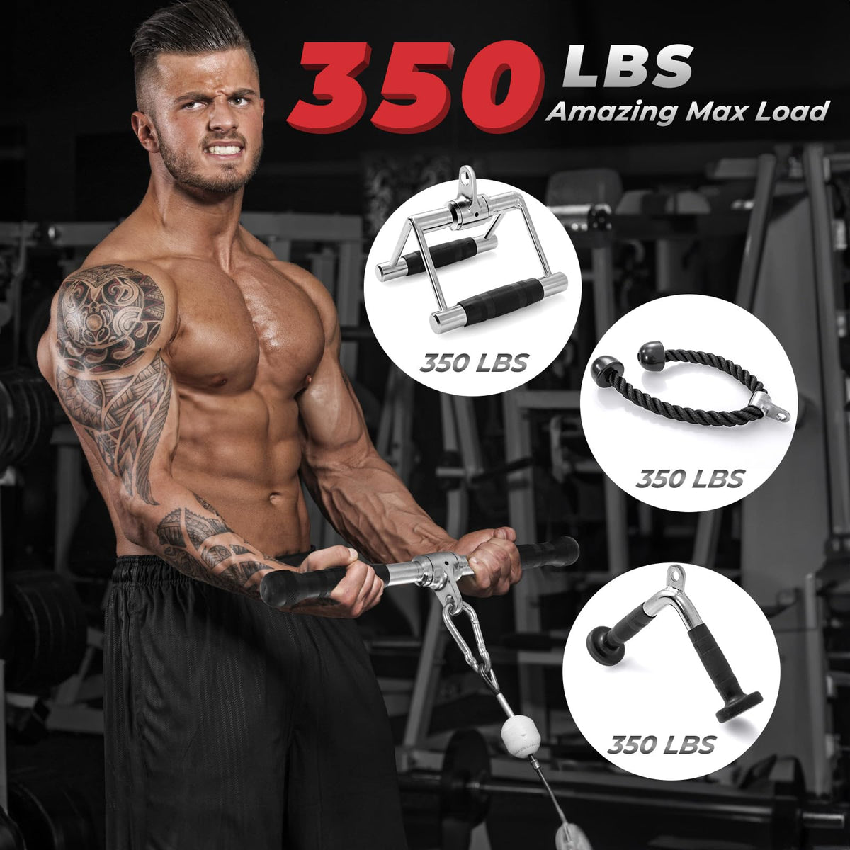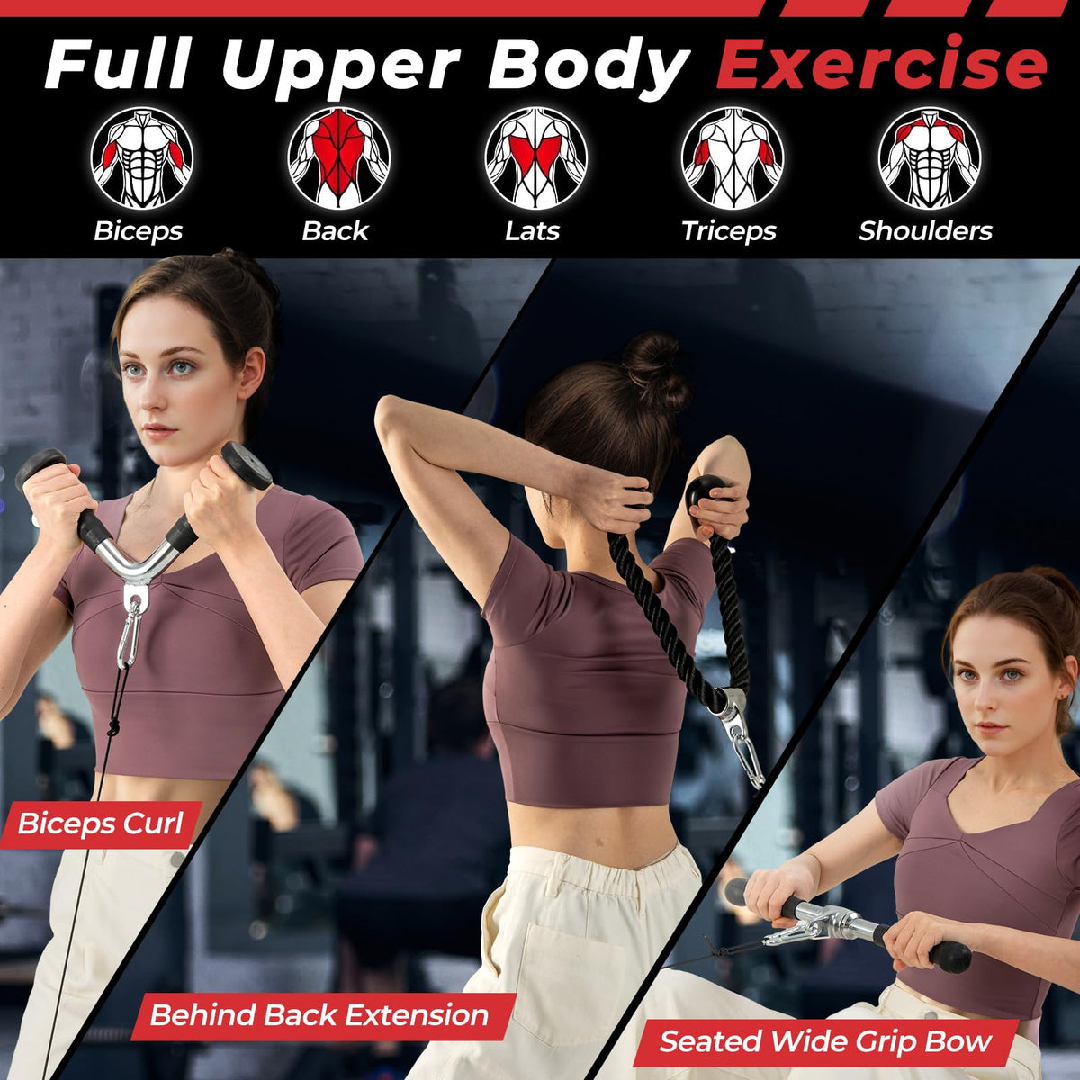 - Multi-Functional Workout Handles: Designed to shape your body, this lat pulldown attachments provides a wide range of workout options to improve physical health and boost self confidence. With this gym set, you can easily practice upright cable row, biceps curl, bent over rowing, Seated Bow, pull down, behind back extension and more.