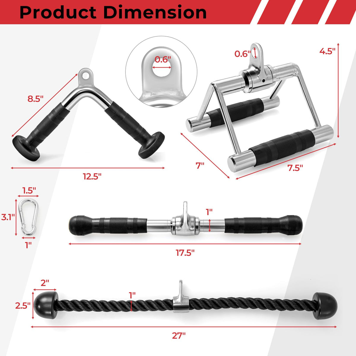- Machine Attachment Set: Including a double D handle, a V-shaped handle, and a triceps rope, this cable machine attachment set will enhance your workout routine.