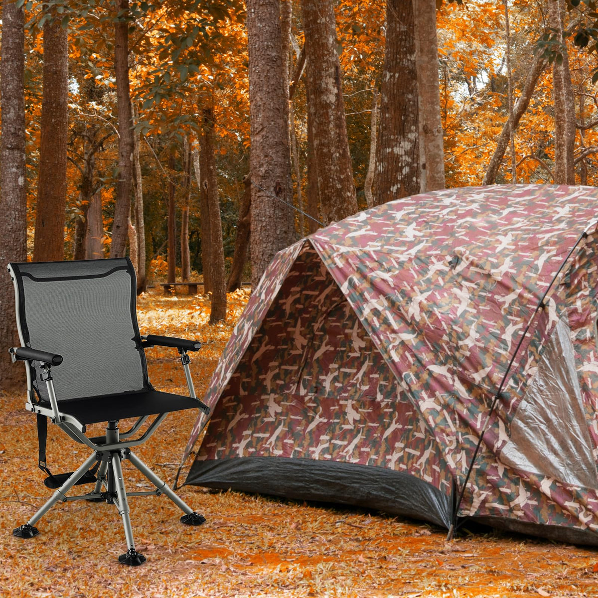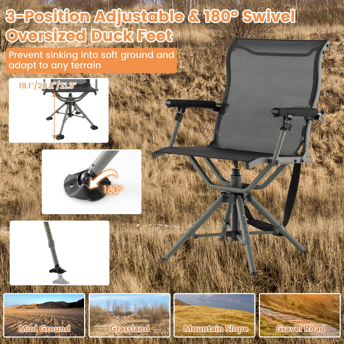 Designed with comfort, convenience, and versatility in mind, this blind hunting chair is the ultimate companion for every hunting adventure. Featuring a 360 degree swivel function, you can effortlessly rotate to any direction to track your target without noise. The sturdy aluminum legs with all-terrain swiveling feet ensure stability even on uneven terrain. And the legs are adjustable in 3 positions to meet your needs. Additional features like breathable fabric seat, ergonomic backrest and adjustable armrests upgrade your comfort. With quick folding design, this hunter chair is portable, making it easy to transport to your hunting spot.