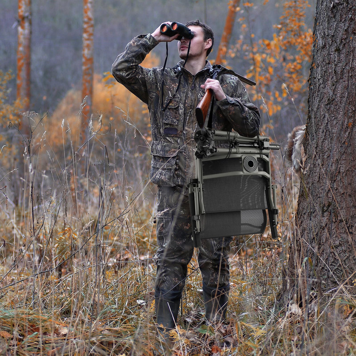 - Foldable & Versatile Design: Our folding hunting chair is the perfect companion for hunters on the go. Its quick folding design allows for easy transportation and storage. The included shoulder strap further ensures hassle-free carrying, so that you can take this versatile outdoor chair for camping, fishing or hunting.
