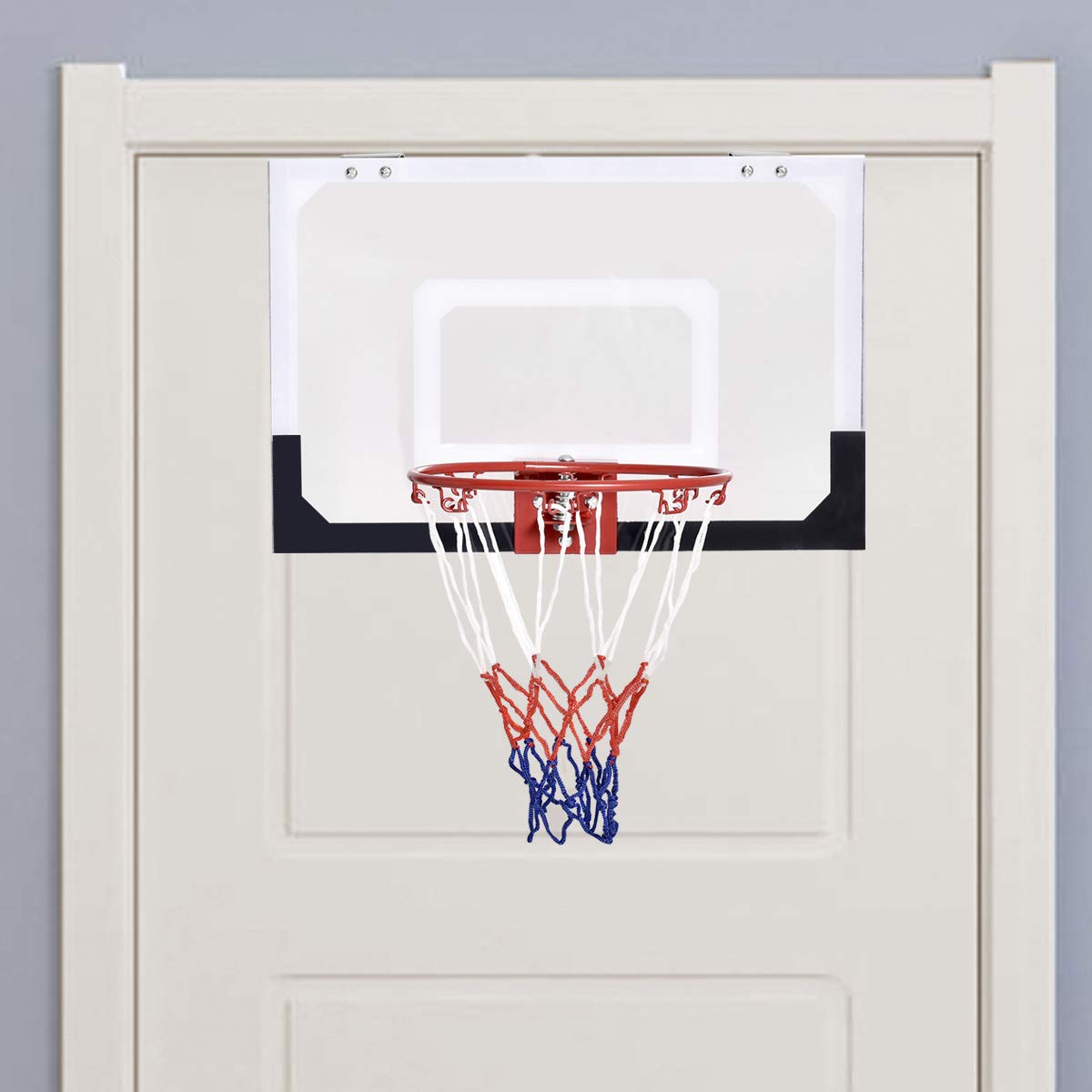 - 【Shooting at Home】Want to play basketball but cannot find a place? Check out GYMAX indoor door-mounted basketball hoop. The sturdy iron hoop features elasticity, allowing you to shoot and dunk with family. Equipped with high quality spring, which would bounce the basket back to its original position, providing each player with realistic basketball experience.