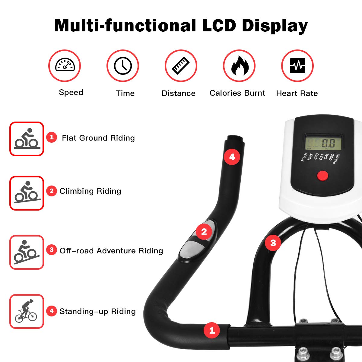 - LCD Monitor & Phone Holder: Equipped with LCD monitor, GYMAX exercising bike can track your time, speed, distance, calories burned while workout. Moreover, device holder enables you to enjoy more entertainment while cycling.