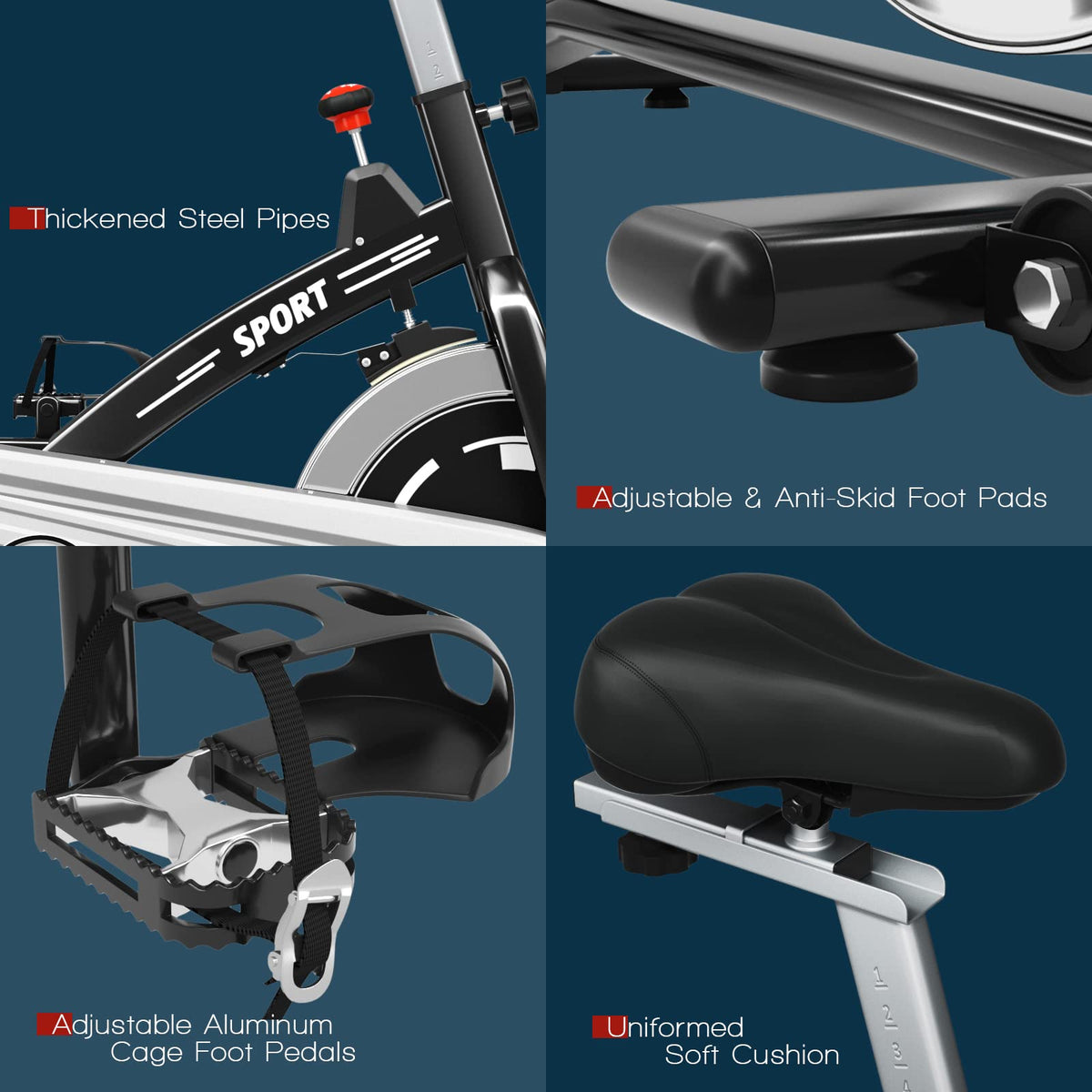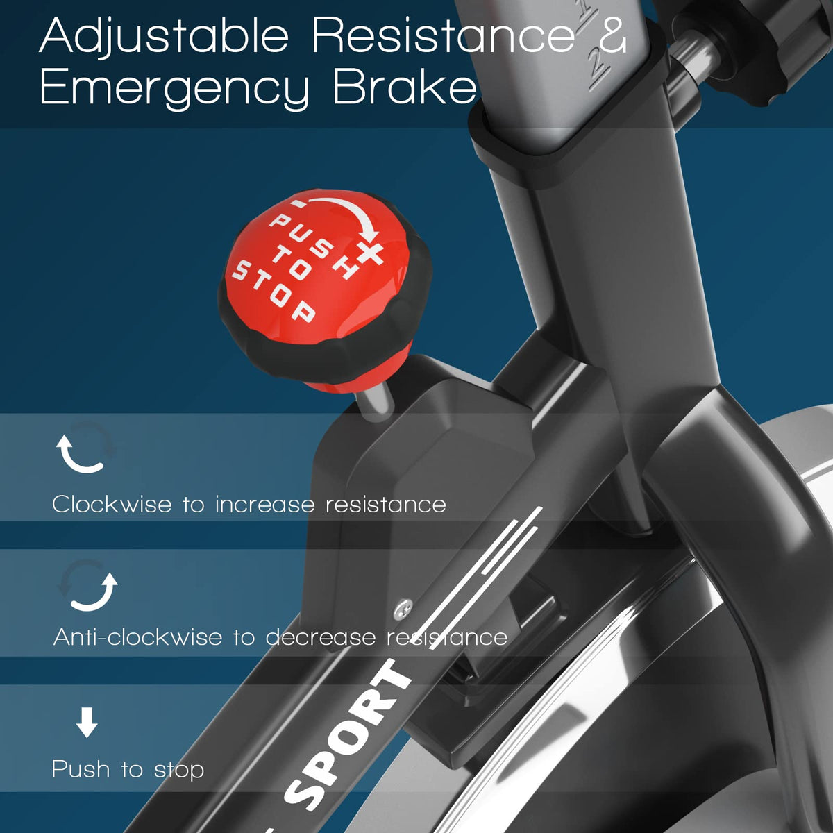 - Friction Adjustable & Safety Knob: Our stationary fitness bike has an emergency stick that works as a press-to-stop button and as well as a resistance control knob. The tension and resistance can be toned up and down precisely. Spinning driven by the belt system is smooth and mute.