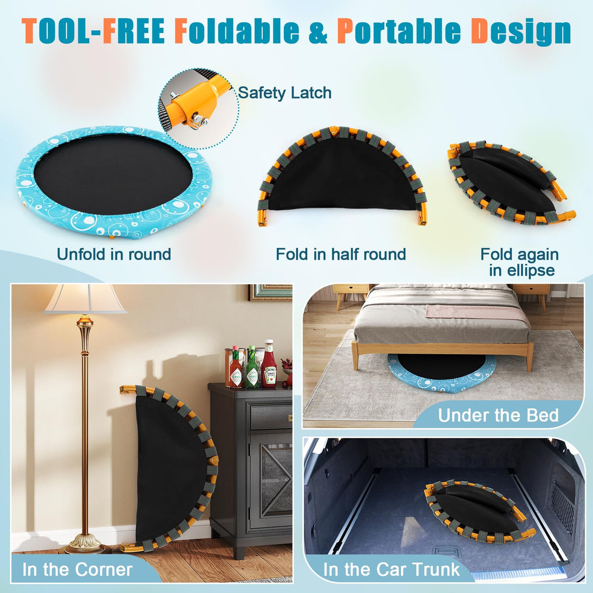 - Collapsible & Compact: GYMAX exercise trampoline is effortless to fold up (measuring 27.5” x 12.5” when folded), and can be stored under bed or sofa easily, ideal for small space.