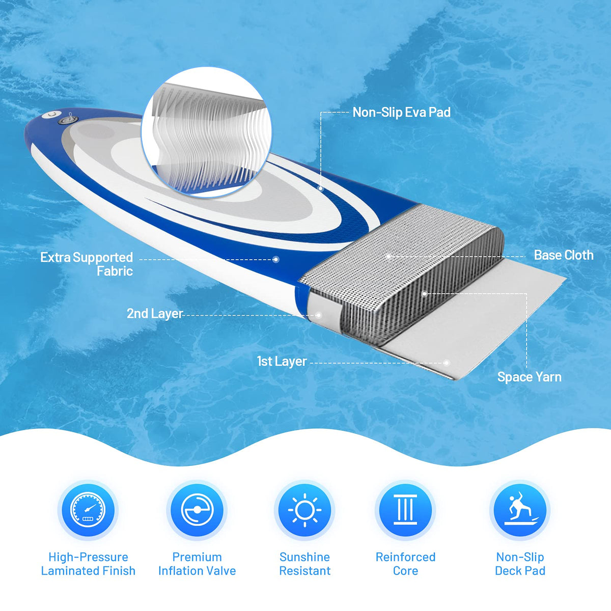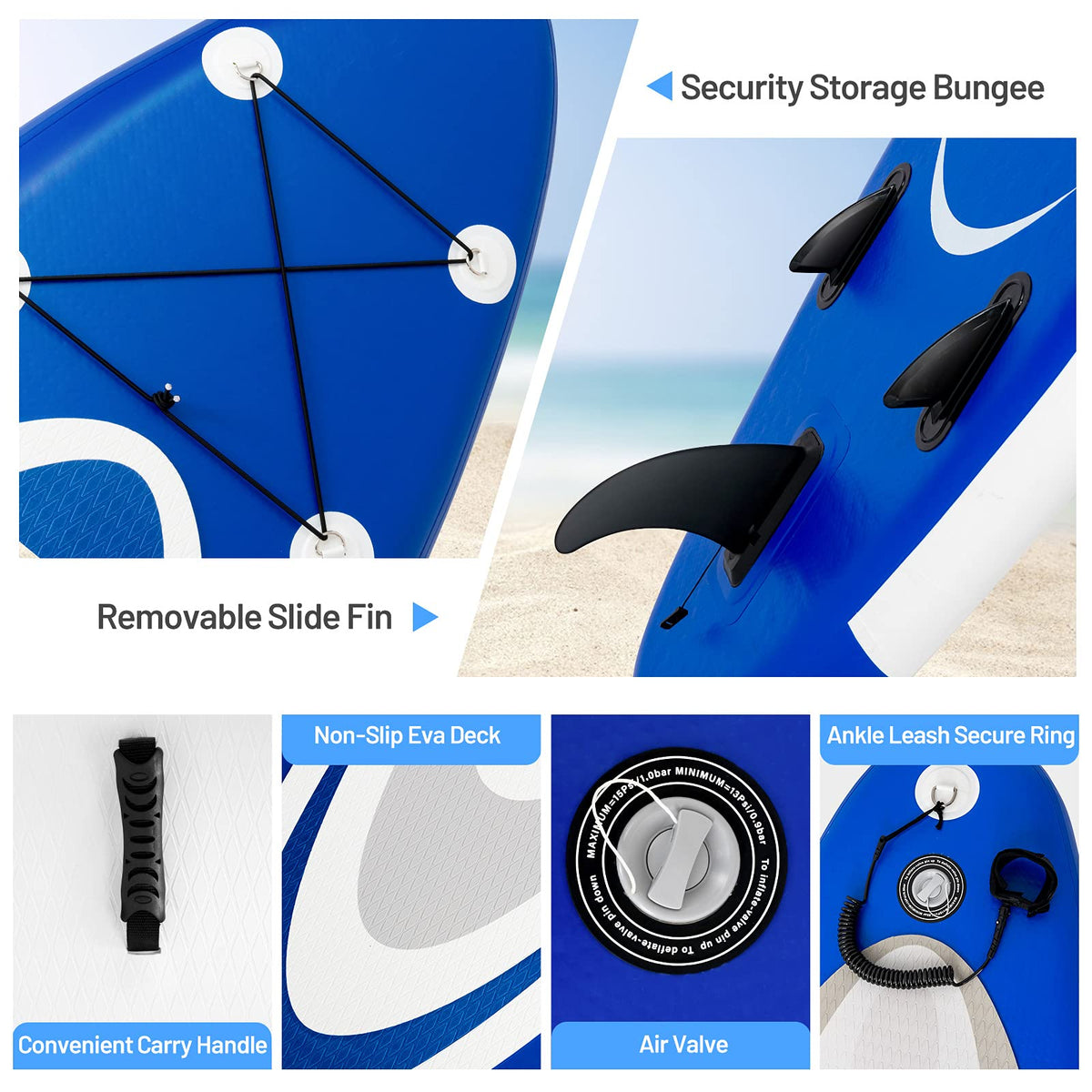 - 【High Quality and Sturdy Construction】The paddle board adopts the high quality EVA and drop-stitch construction, which allow the surfboard withstand a lot of pressure without deforming or bursting. And the EVA has good friction, which will prevent you from sliding. It's sturdy and safe for long time use.