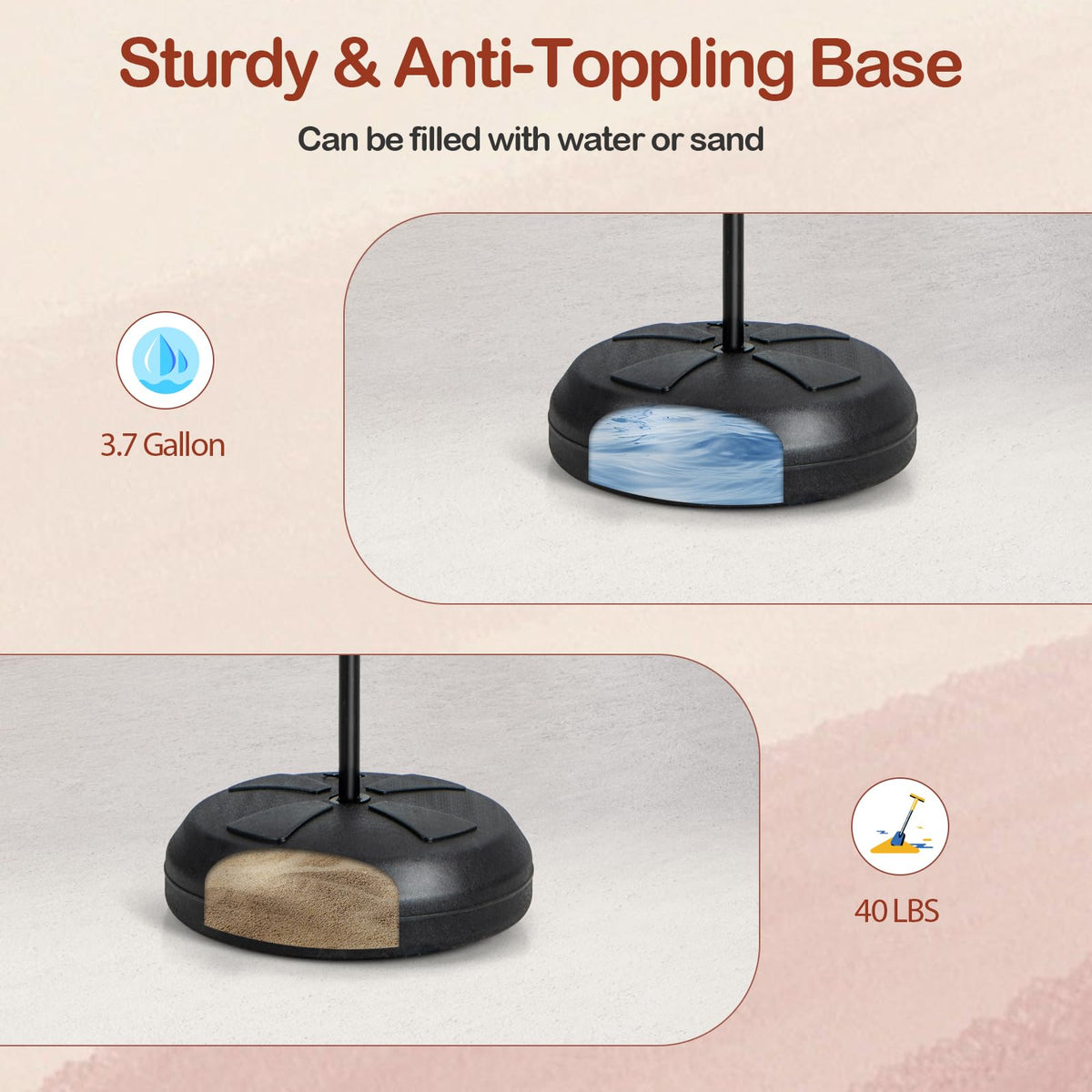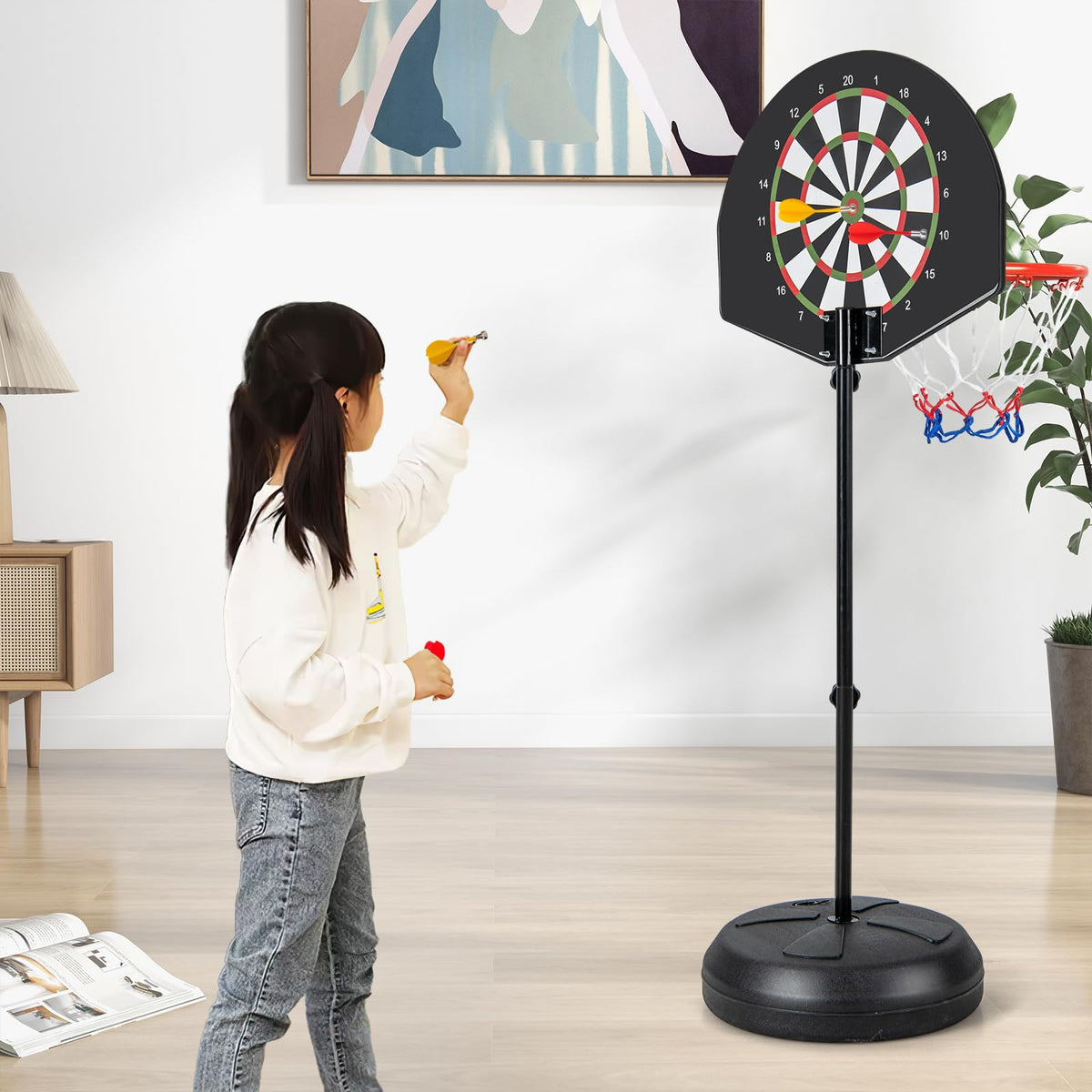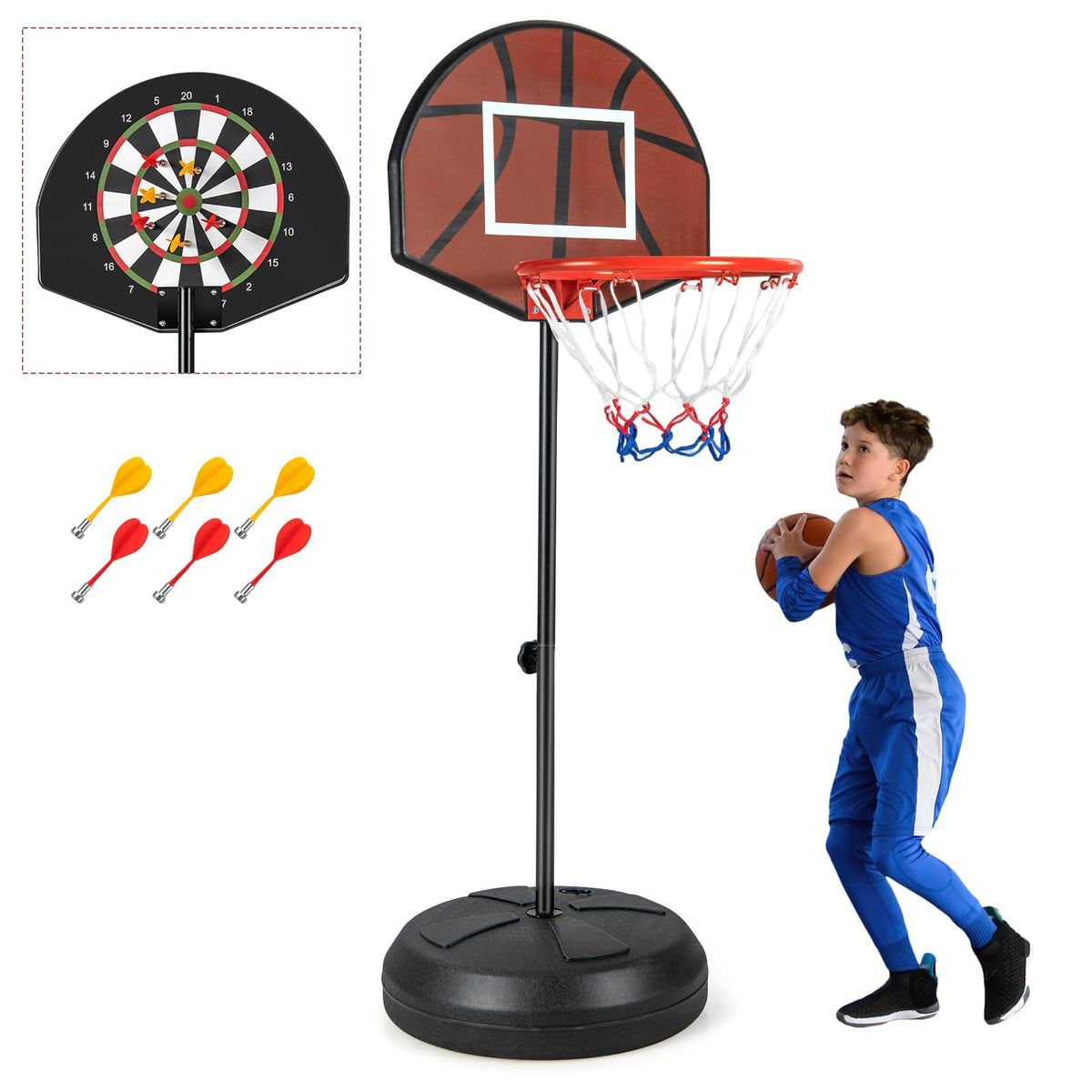 - Portable & Stable Base: The base can be filled with 3.7 gallon of water or 40 lbs of sand, ensuring stability and safety. The integrated portable handle allows kids and families to enjoy basketball and darts in various indoor and outdoor locations.