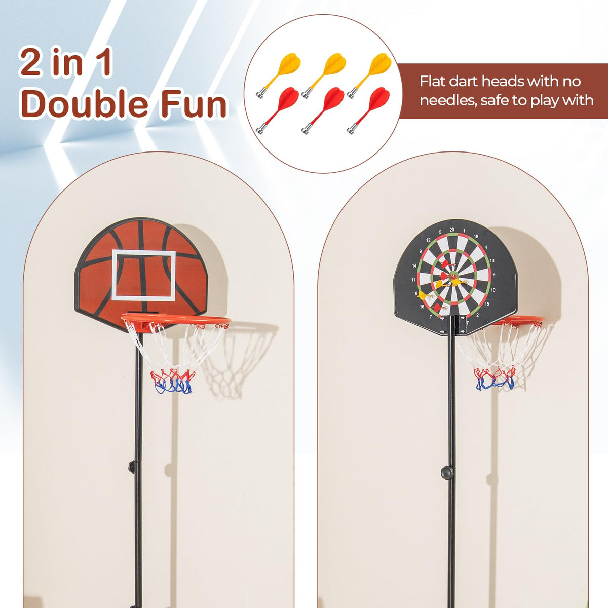 - 2 in 1 Double Fun: This unique basketball hoop for kids is built with a dart board on the reverse side of the backboard, which maximizes fun and provides various options for play. The set includes 6 darts featuring flat dart heads with no needles, safe for kids to play with.