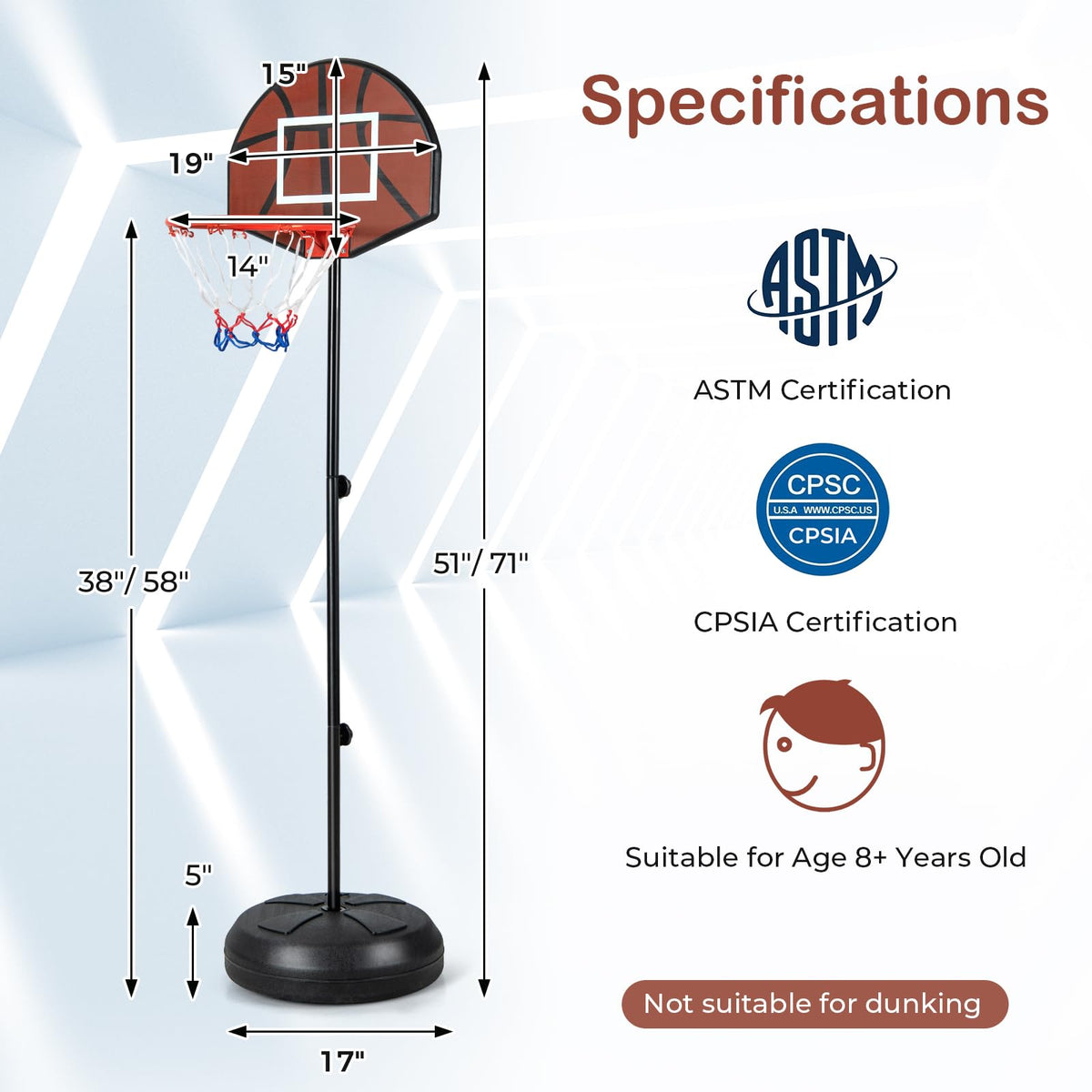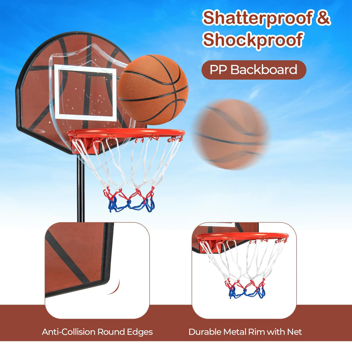 - Robust & Safe Construction: Built with rustproof metal pipes and a shatterproof, shockproof PP backboard, this kids basketball hoop system is made to last and withstand vigorous play. Compliant with ASTM and CPSIA, it ensures a safe environment for all children to play.