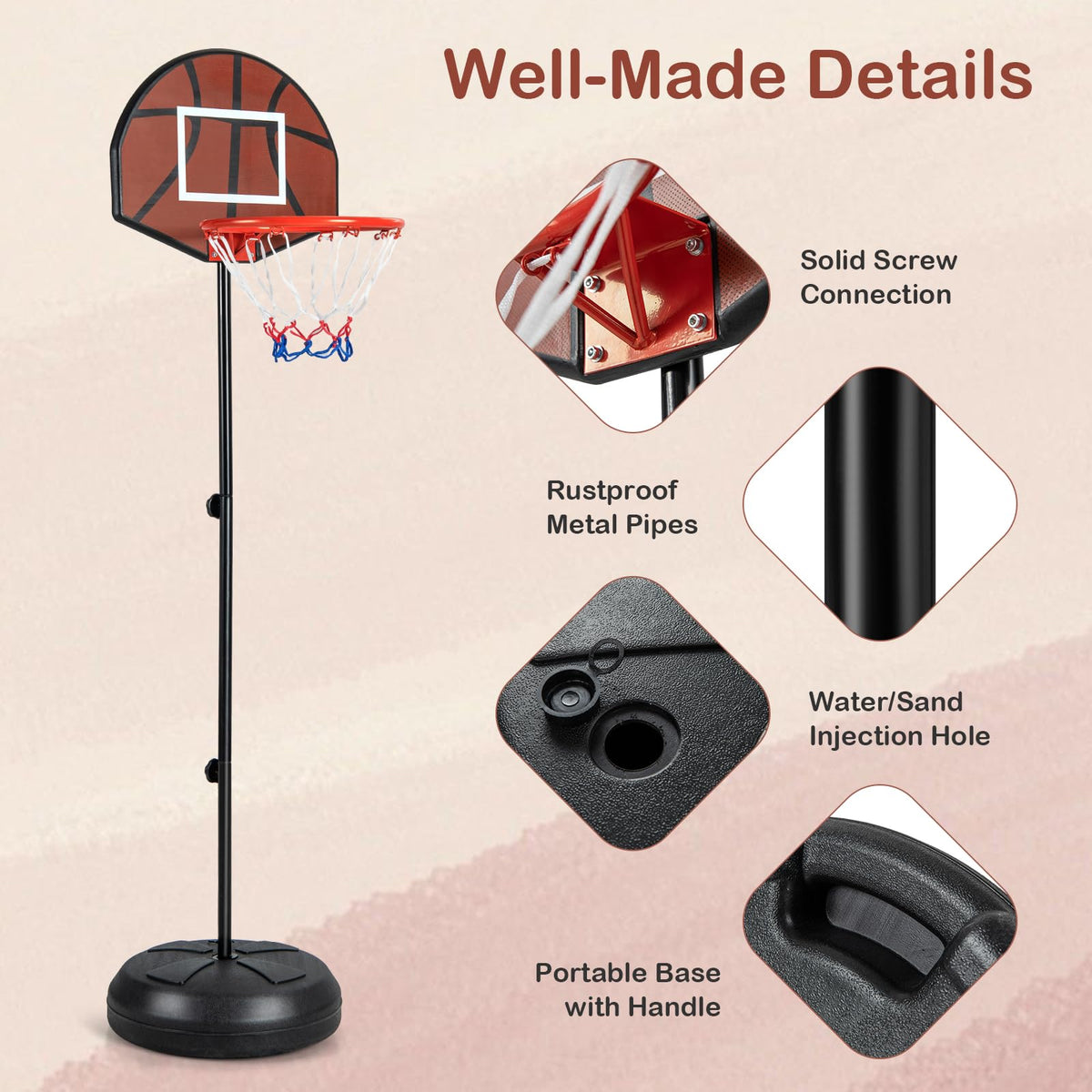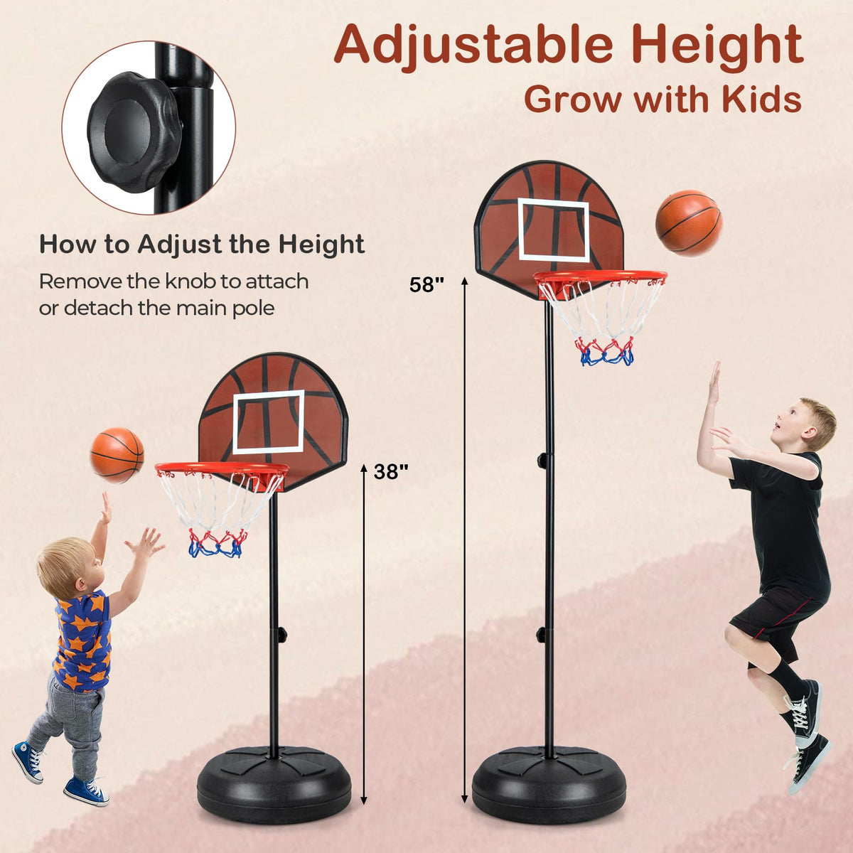- How to Adjust the Height: You can remove the knob to attach or detach the main pole and adjust the basketball hoop stand to different heights (floor to rim height: 38"/58"), catering to growing children.